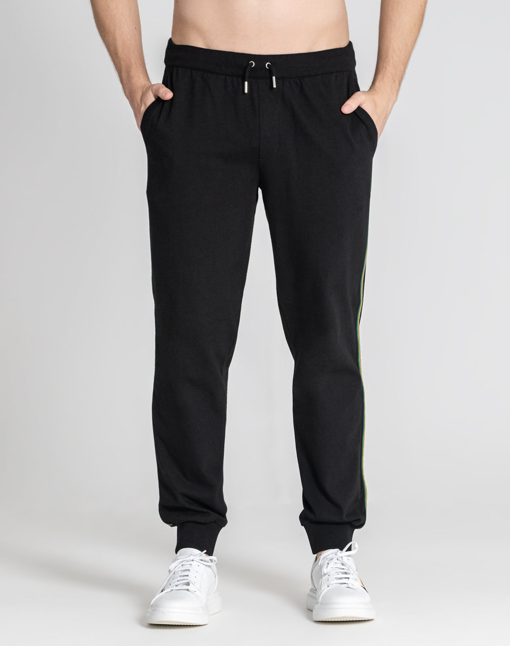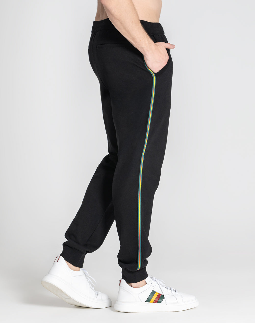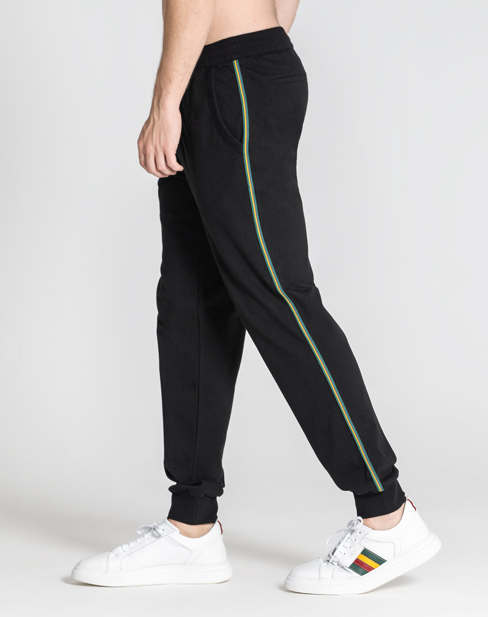 Calças de fato de treino 100% algodão orgânico. Bolsos de faca arredondados na frente e bolso de vivo nas costas com logótipo da marca bordado à cor da peça por cima do bolso. Punhos e cinto em rib com cordões para melhor ajuste. Laterais das calças com fita de nastro com as cores da marca.