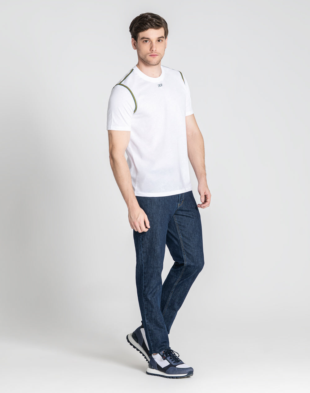 T-shirt em algodão orgânico com decote redondo. Logótipo JEF bordado na cor verde JEF. Fita de nastro com cores da marca sobrepõem cavas e ombros.