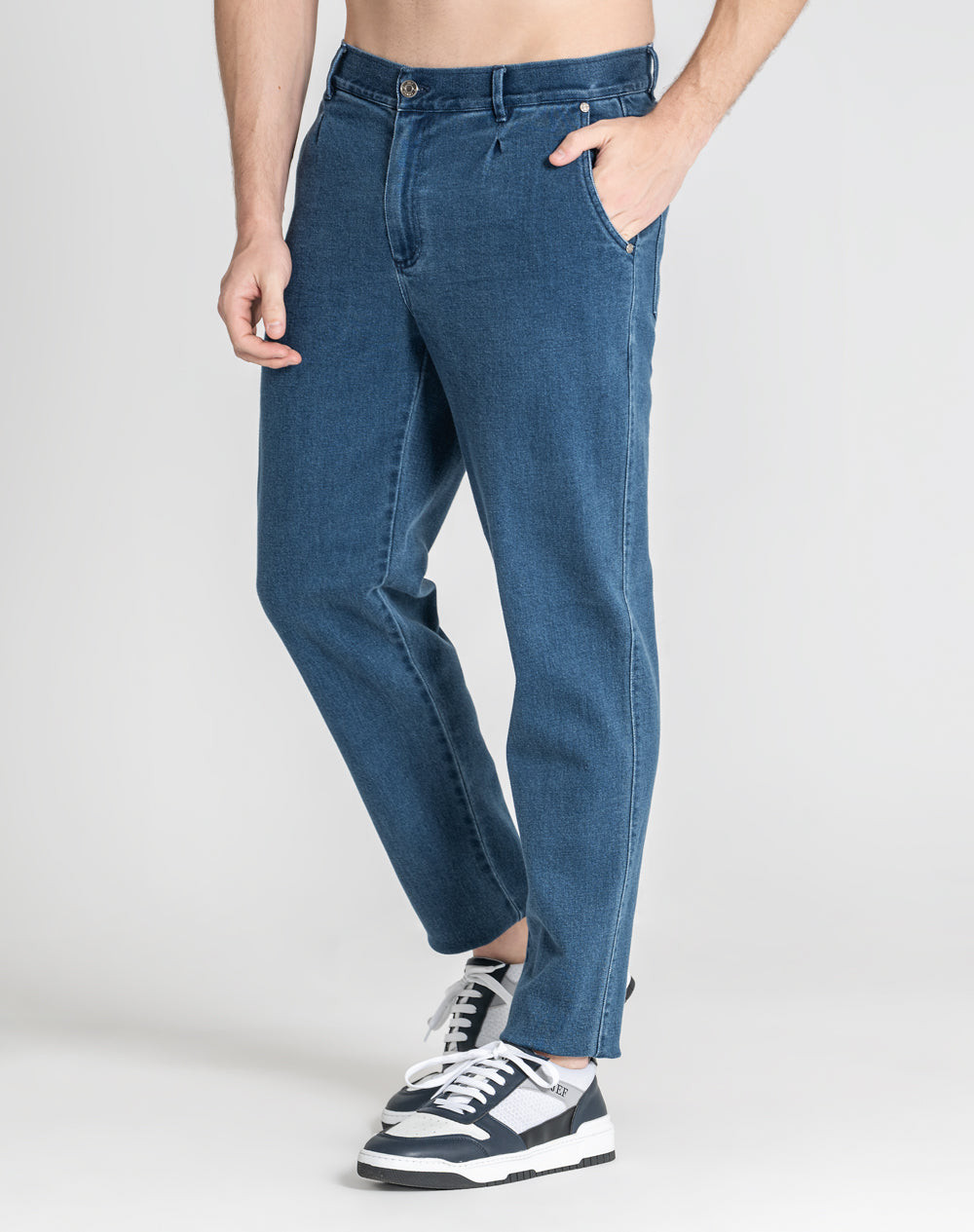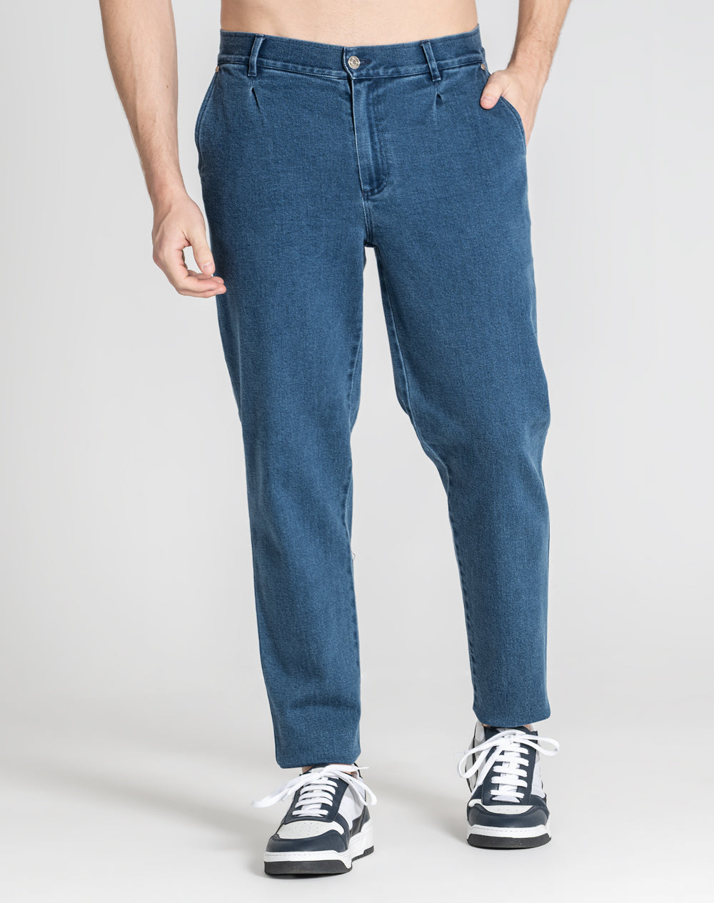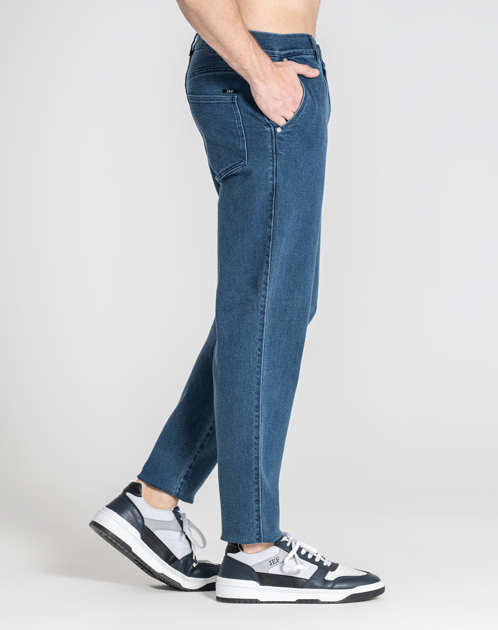 Calças estilo carrot em denim. Na frente bolsos redondos e nas costas bolsos de chapa. Estilo 4 bolsos. Pinças na frente. Etiqueta preta JEF na horizontal por cima do bolso nas costas.