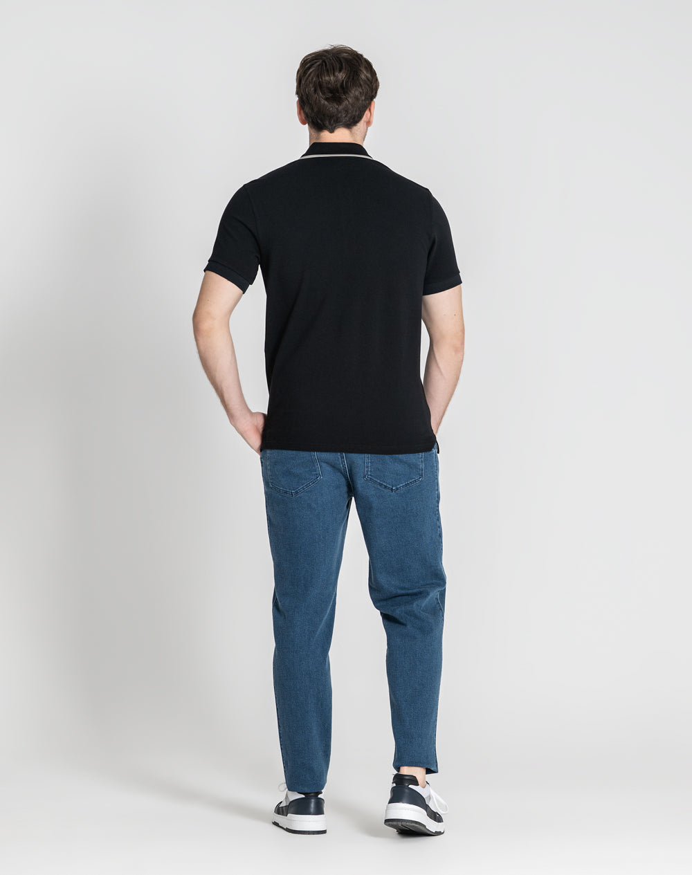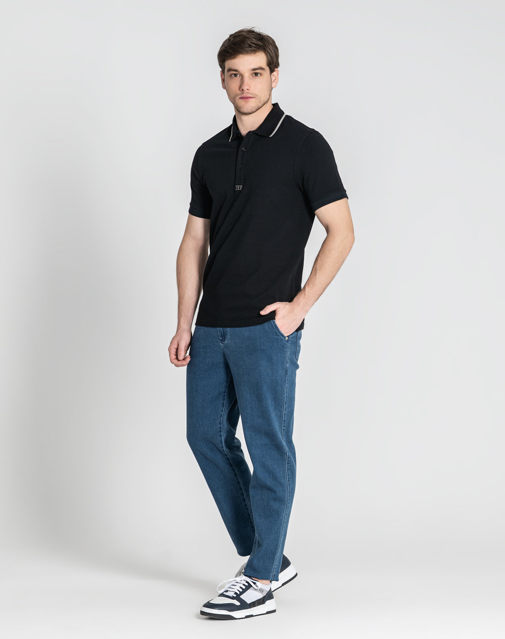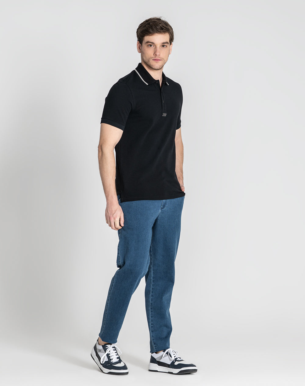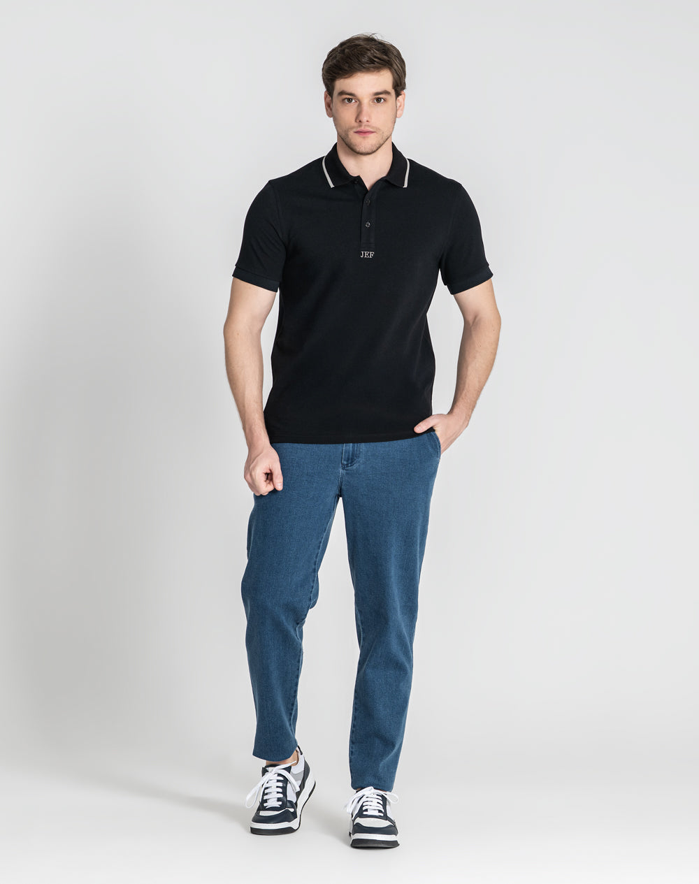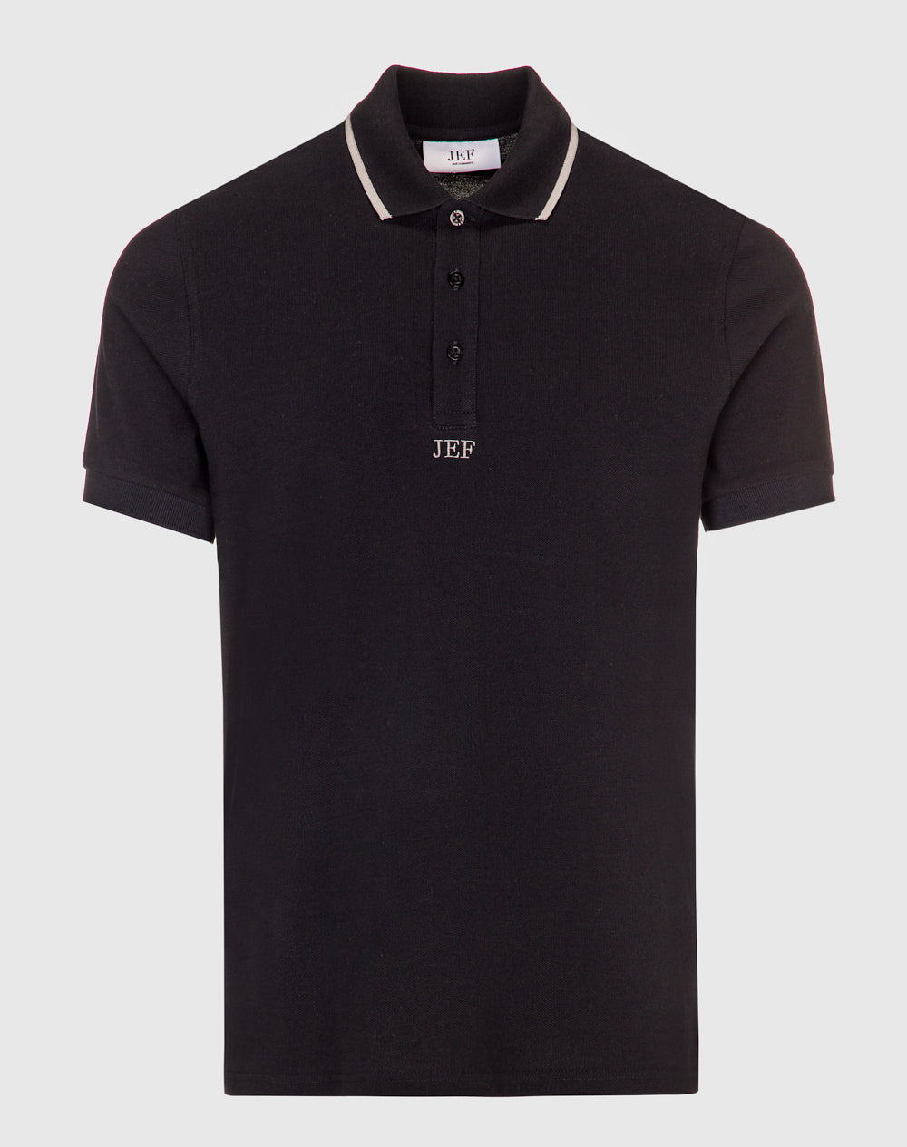 Polo manga curta em algodão. Logótipo JEF da marca bordado na cor de contraste. Abotoado por 3 botões no meio frente. Gola com risca à cor de contraste. Pequenas rachas nas laterais.