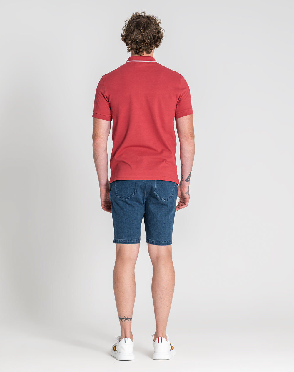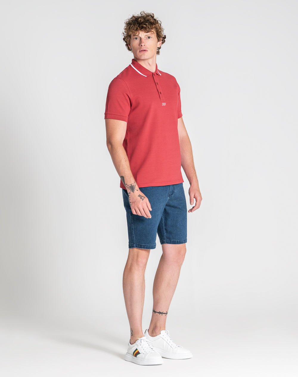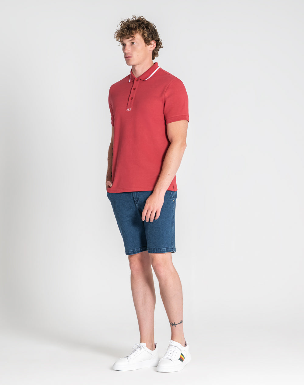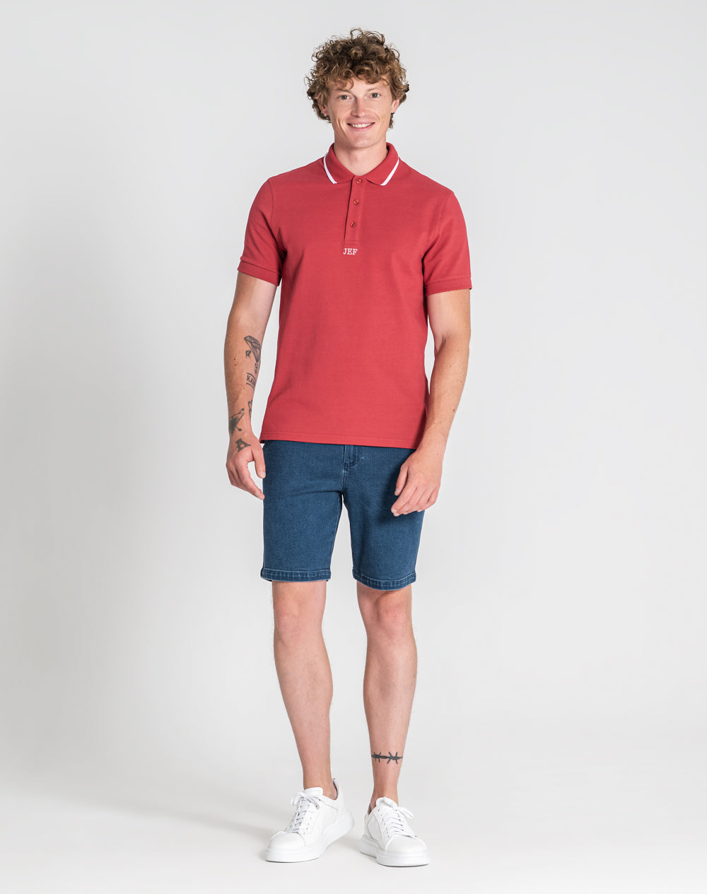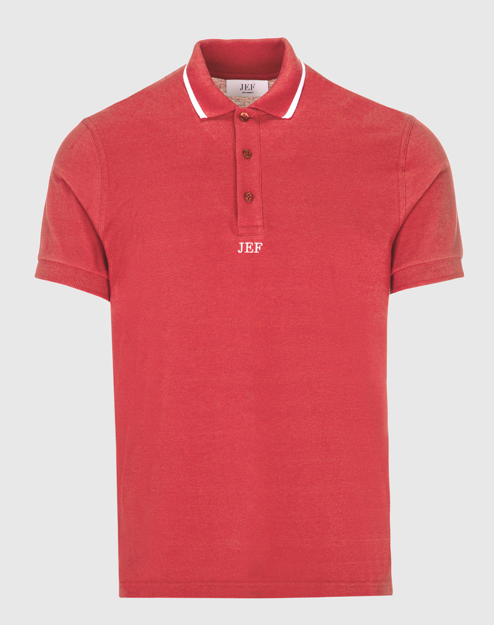 Polo manga curta em algodão. Logótipo JEF da marca bordado na cor de contraste. Abotoado por 3 botões no meio frente. Gola com risca à cor de contraste. Pequenas rachas nas laterais.