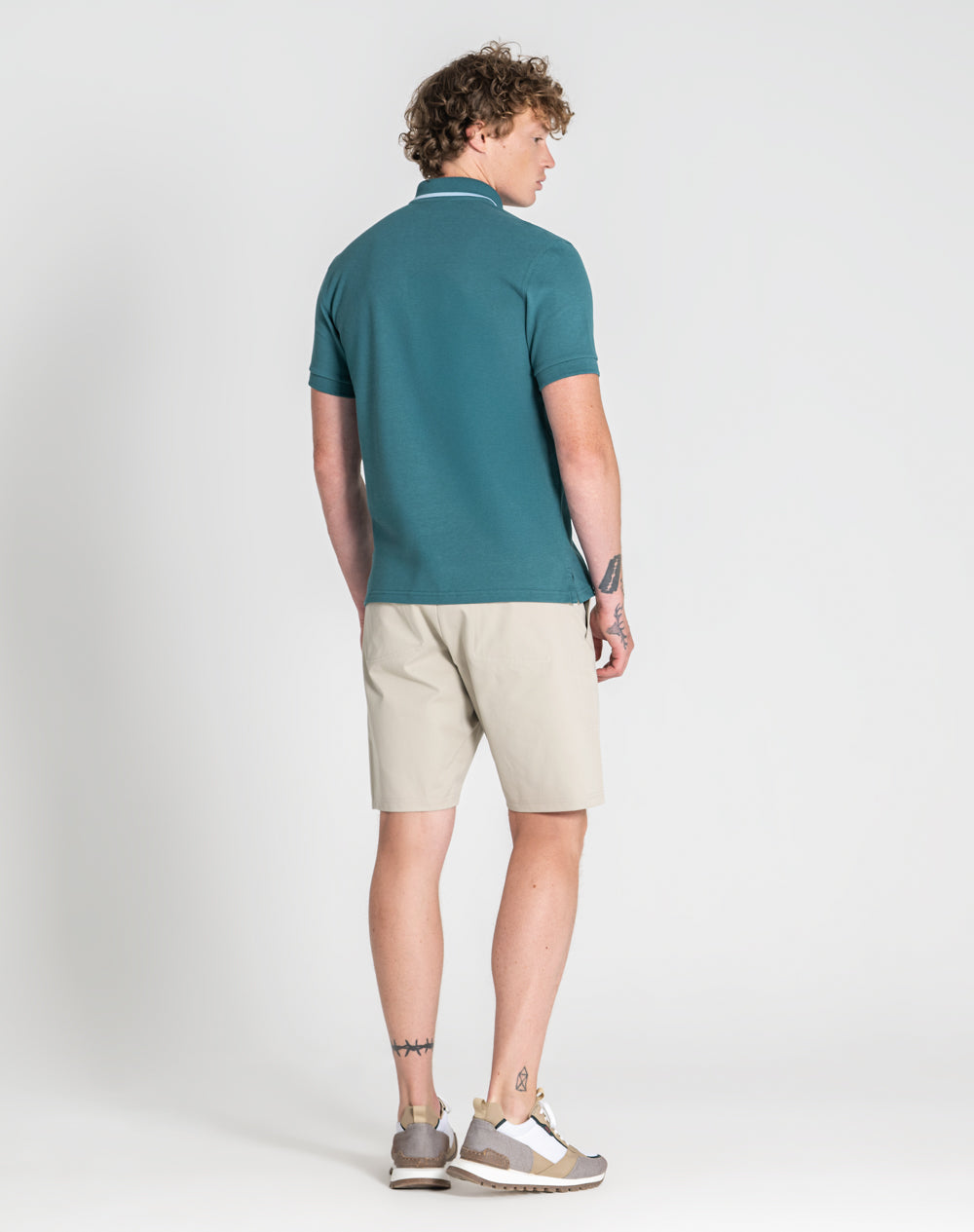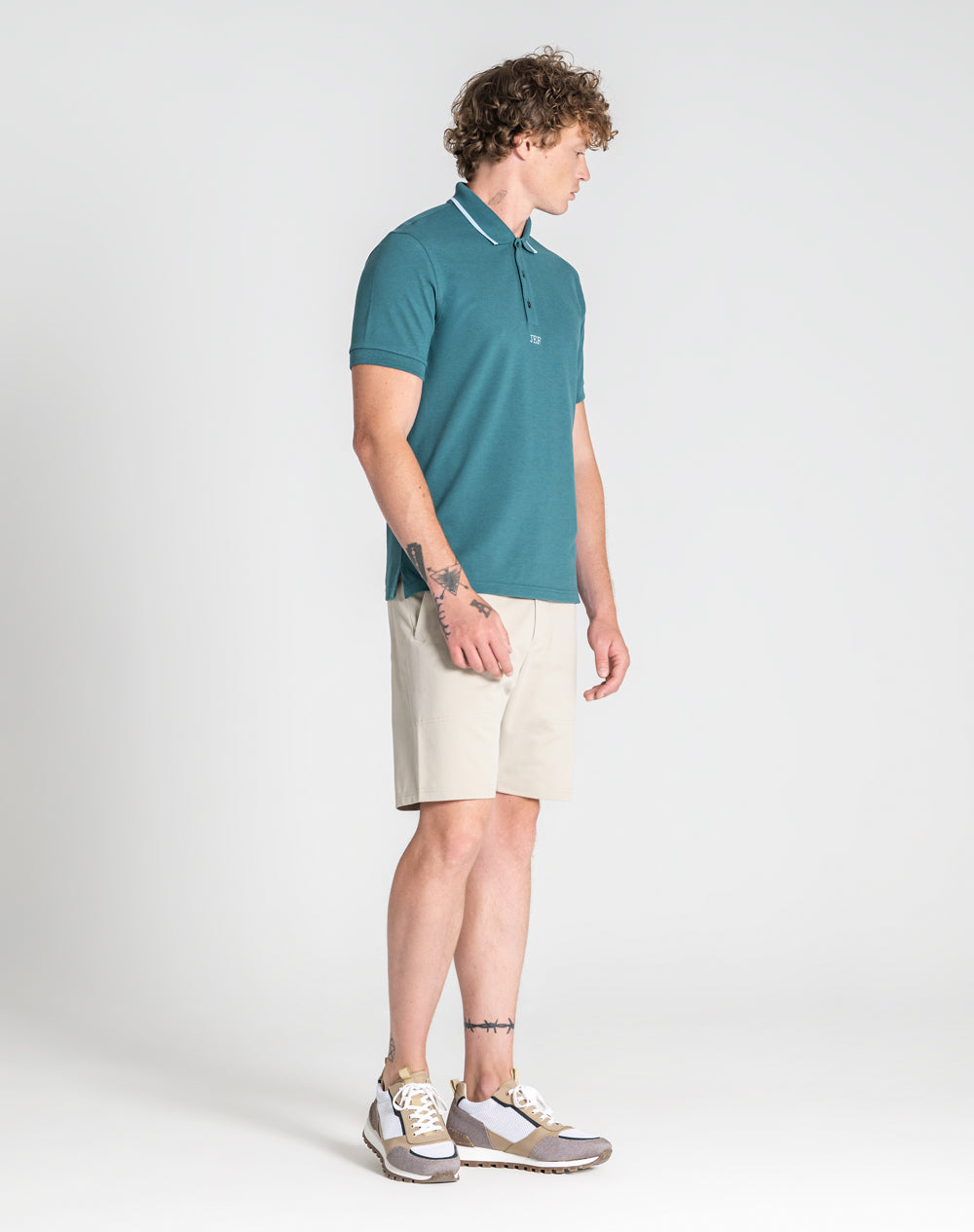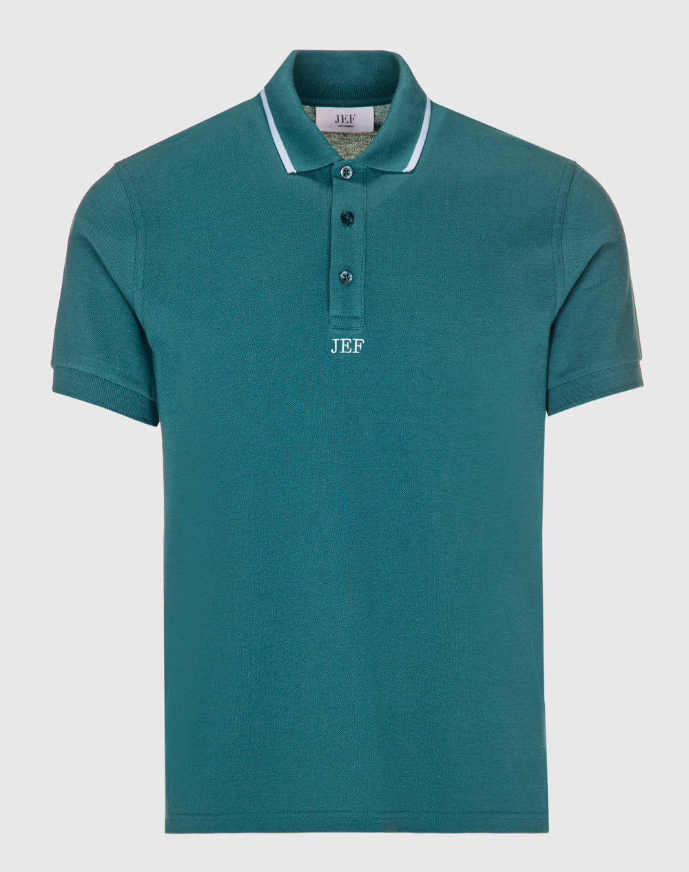 Polo manga curta em algodão. Logótipo JEF da marca bordado na cor de contraste. Abotoado por 3 botões no meio frente. Gola com risca à cor de contraste. Pequenas rachas nas laterais.