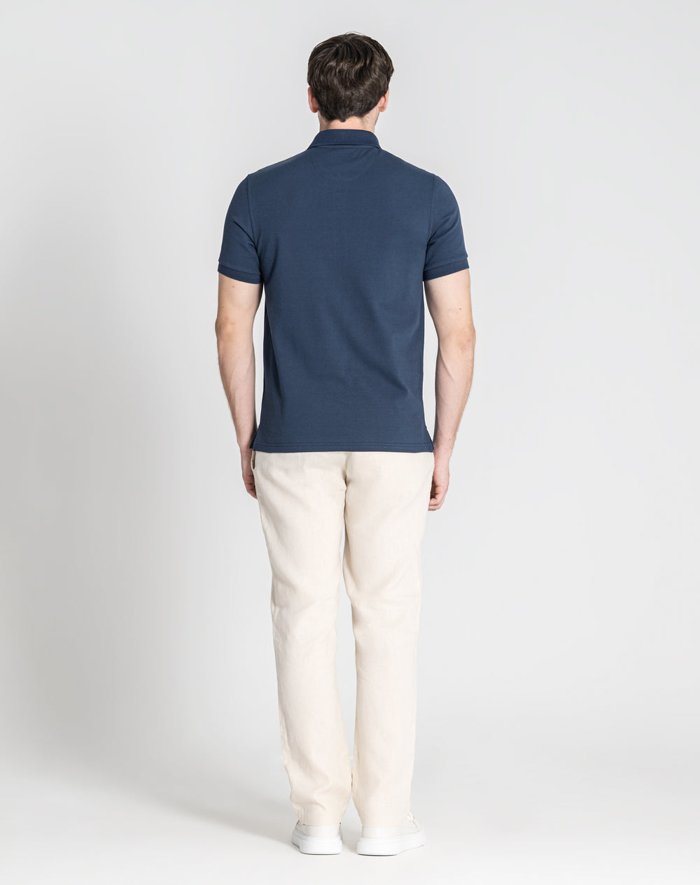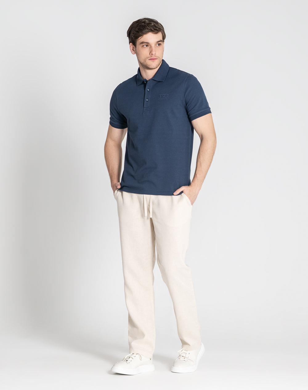 Polo de manga curta em algodão. Gola com desenho. Logótipo JEF através da técnica embossed 3D na frente. Abotoado por 3 botões no meio frente. Meia-lua estampada no tecido estampado alusivo ao tema. Pequenas rachas nas laterais.