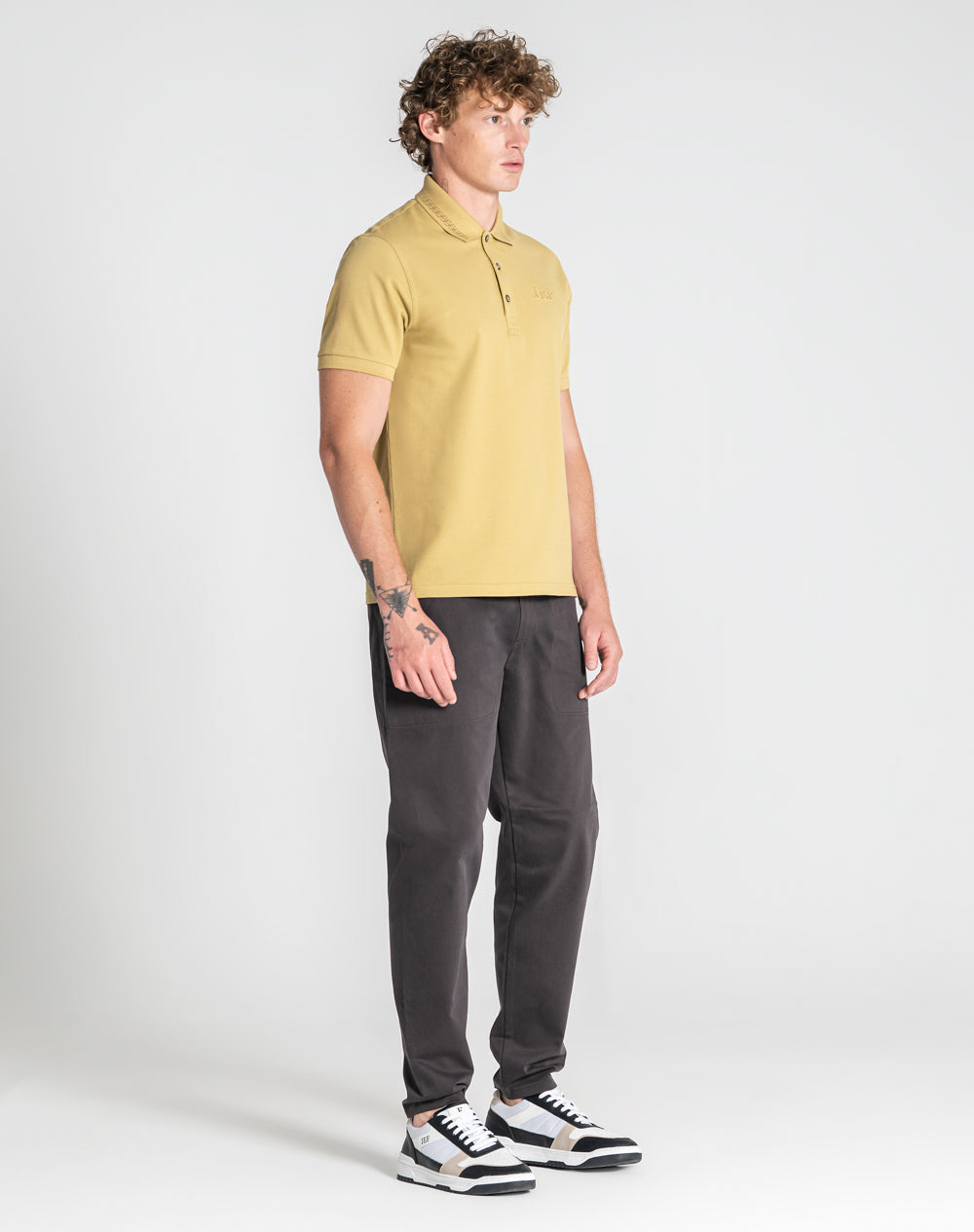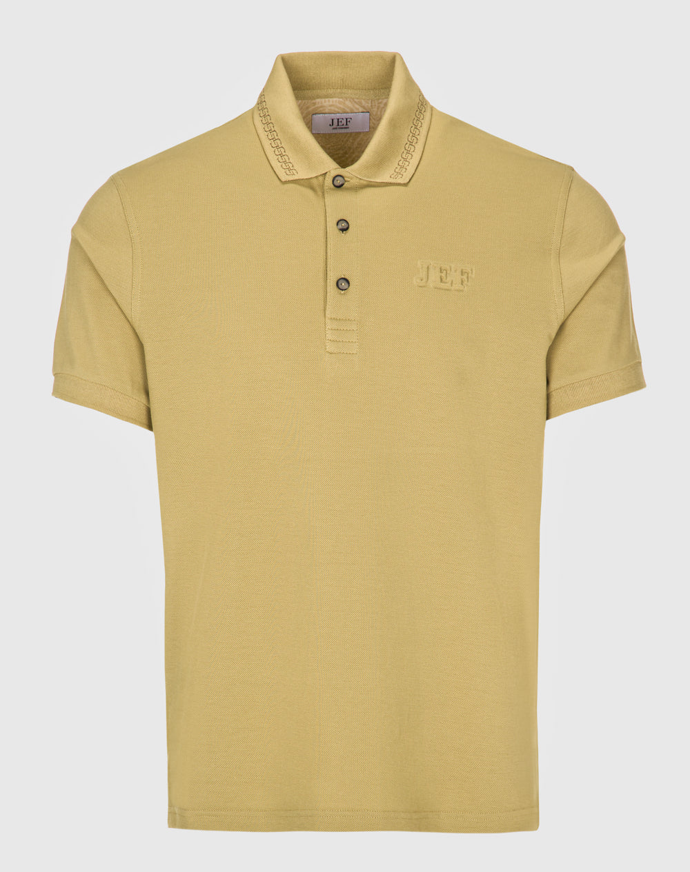 Polo de manga curta em algodão. Gola com desenho. Logótipo JEF através da técnica embossed 3D na frente. Abotoado por 3 botões no meio frente. Meia-lua estampada no tecido estampado alusivo ao tema. Pequenas rachas nas laterais.