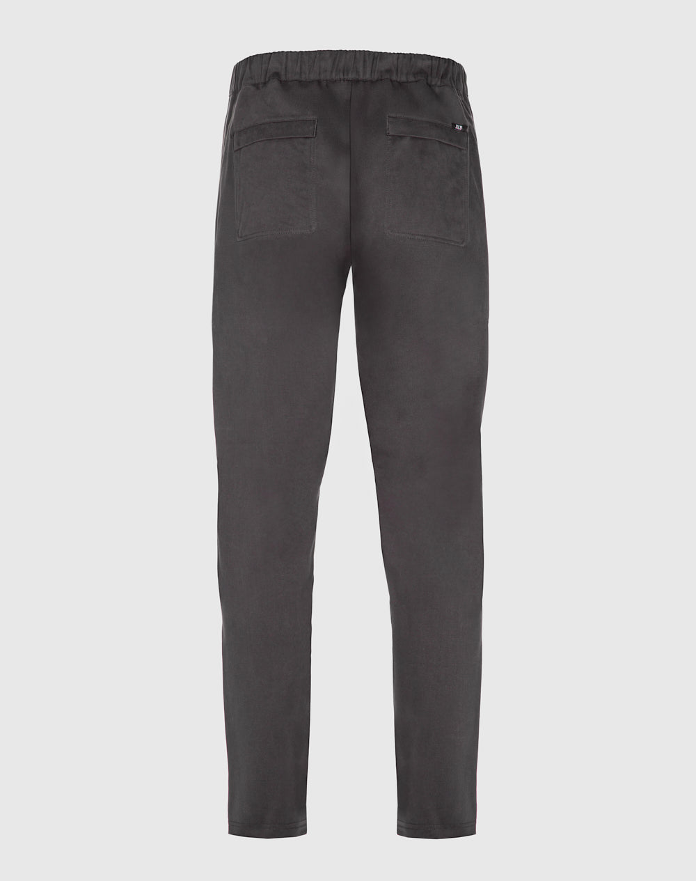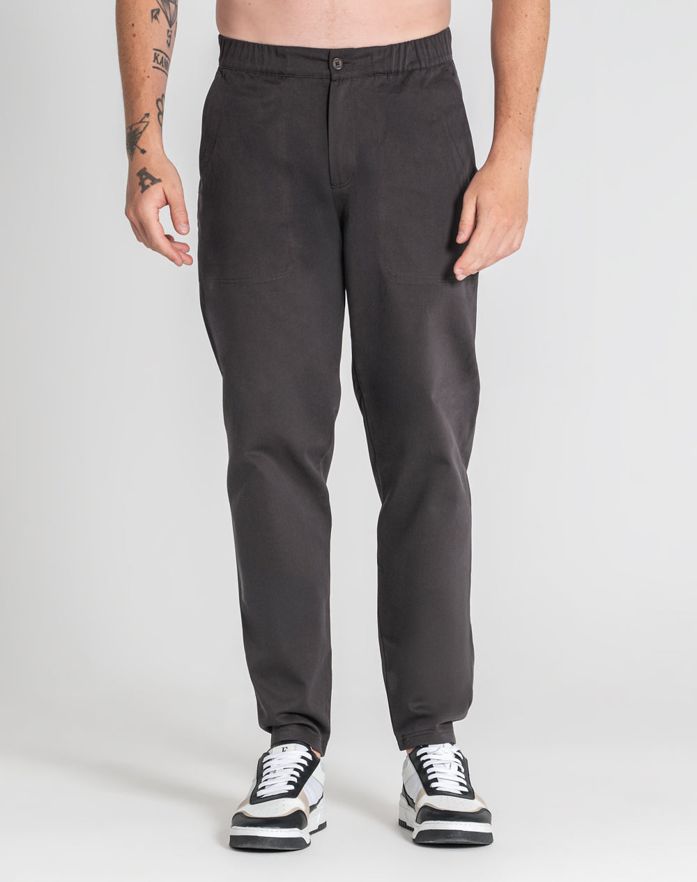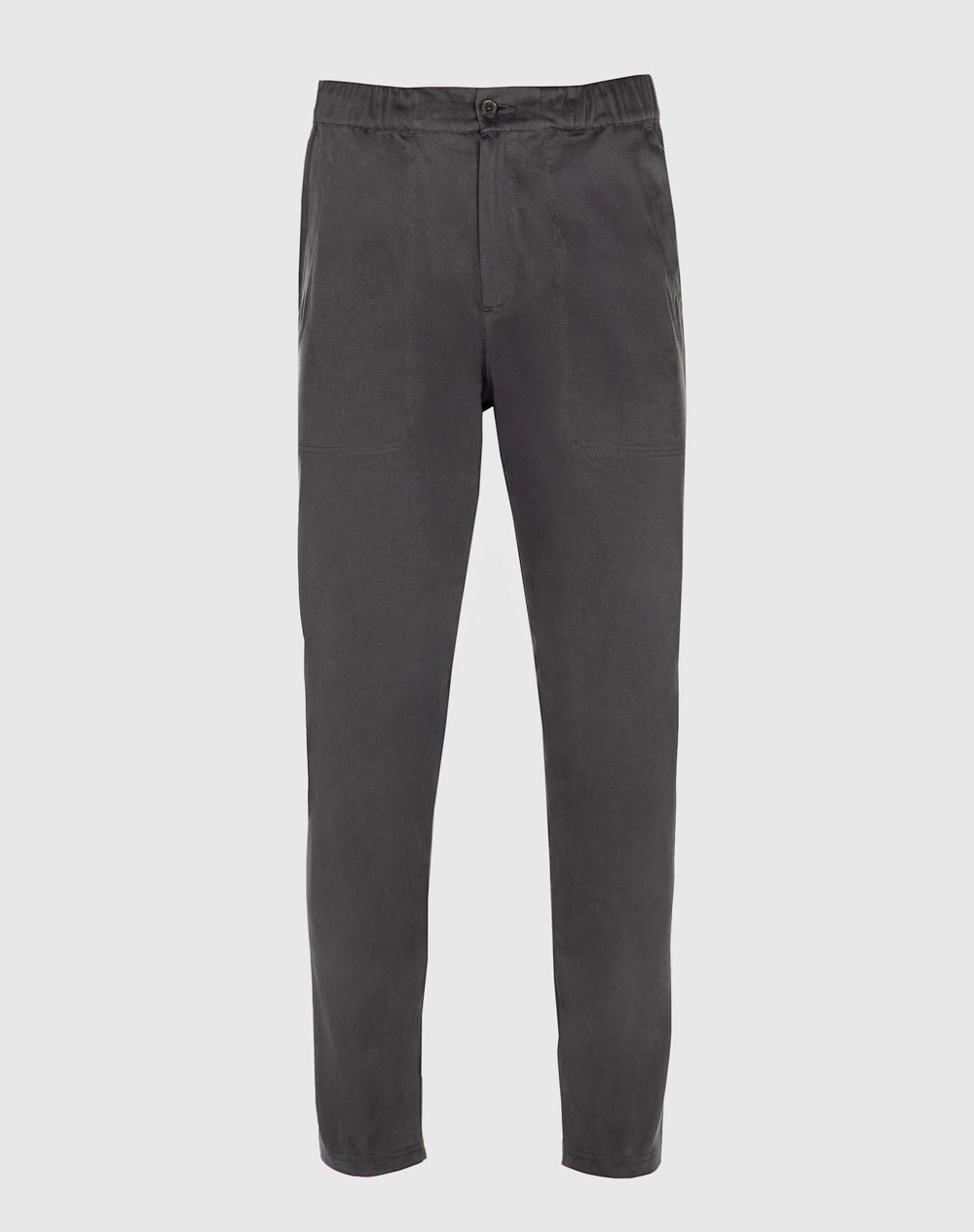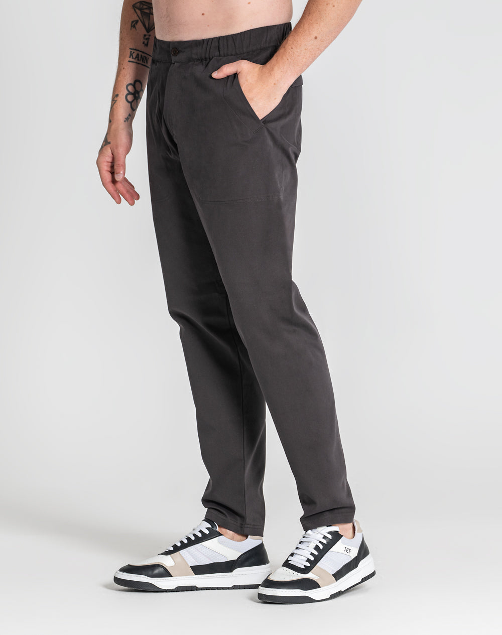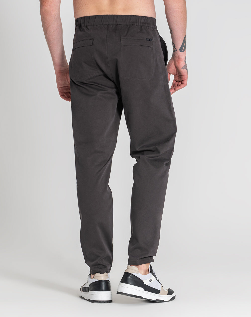 Calças estilo utilitário em sarja. Cinto com elástico e botão. Na frente bolsos de faca e nas costas bolsos de vivo. Estilo 4 bolsos. Etiqueta preta JEF na horizontal por cima do bolso nas costas.