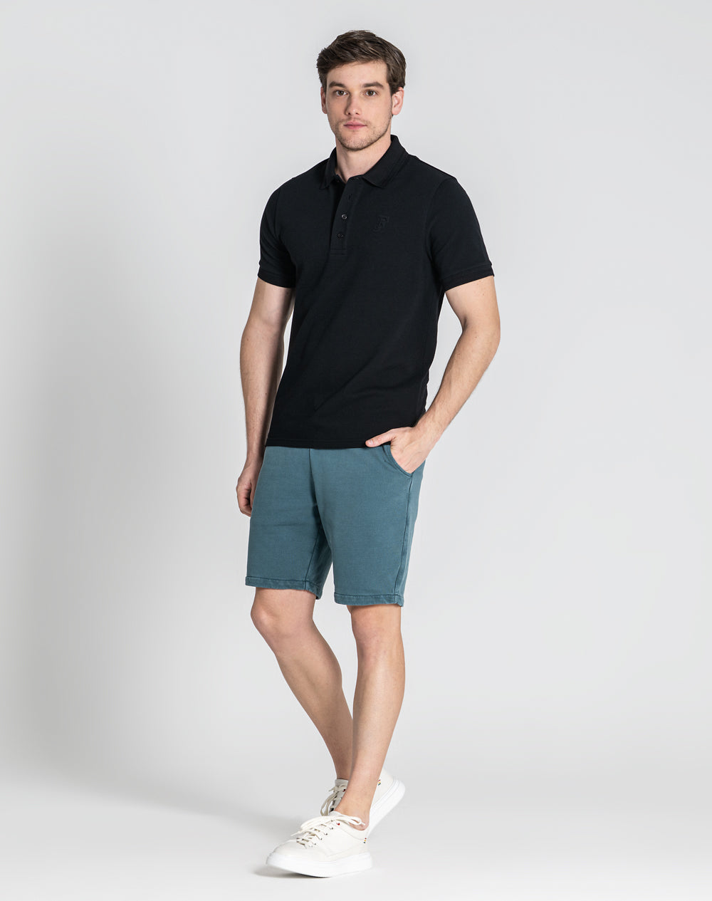 Polo de manga curta em algodão. Gola e punhos da manga com desenho em espinha. Abotoado por 4 botões numa plaquete larga. Logótipo do ícone da marca através da técnica embossed 3D. Pequenas rachas nas laterais.