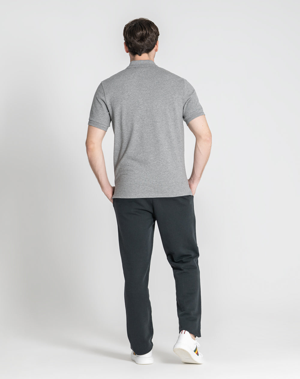 Polo de manga curta em algodão. Gola e punhos da manga com desenho em espinha. Abotoado por 4 botões numa plaquete larga. Logótipo do ícone da marca através da técnica embossed 3D. Pequenas rachas nas laterais.