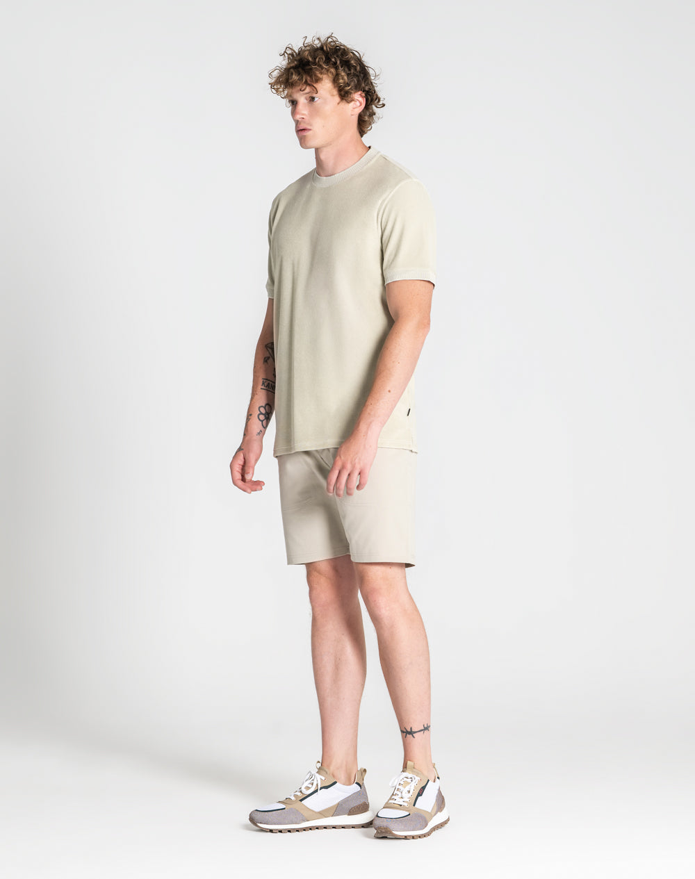 T-shirt de manga curta em peluche. Etiqueta preta JEF na vertical metida na costura lateral. Punhos das mangas com desenho. Pequenas rachas laterais.