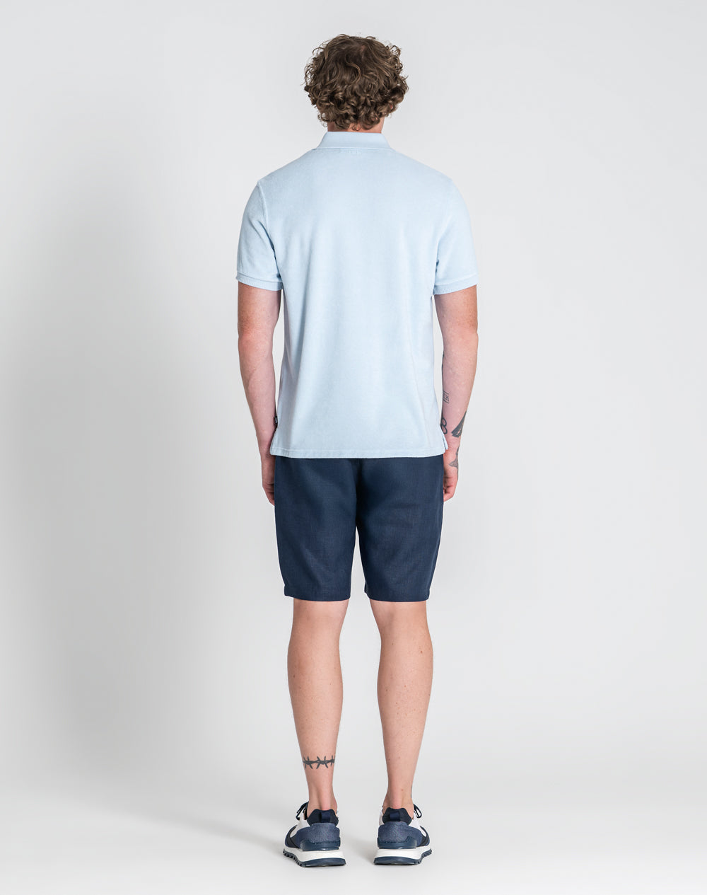 Polo de manga curta em peluche. Logótipo JEF da marca bordado à cor da peça nas costas. Abotoado por 3 botões no meio frente. Etiqueta preta JEF na vertical metida na costura lateral. Punhos das mangas com desenho. Pequenas rachas laterais.