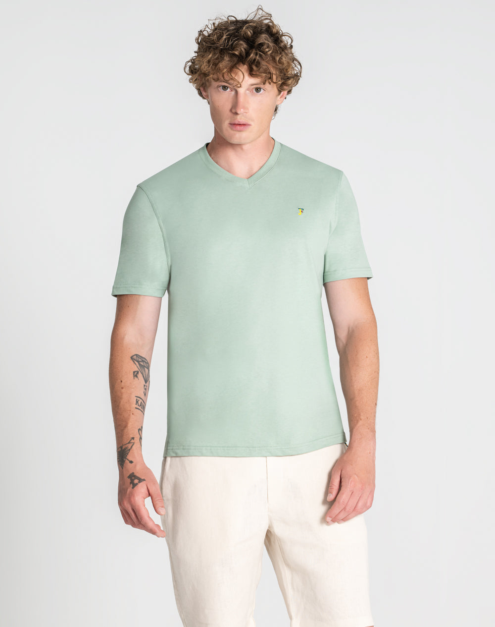 T-shirt em jersey orgânico com decote em V. Logótipo da marca bordado com cores da marca na frente. Meia-lua nas costas na própria malha com bordado JEF à cor da peça.