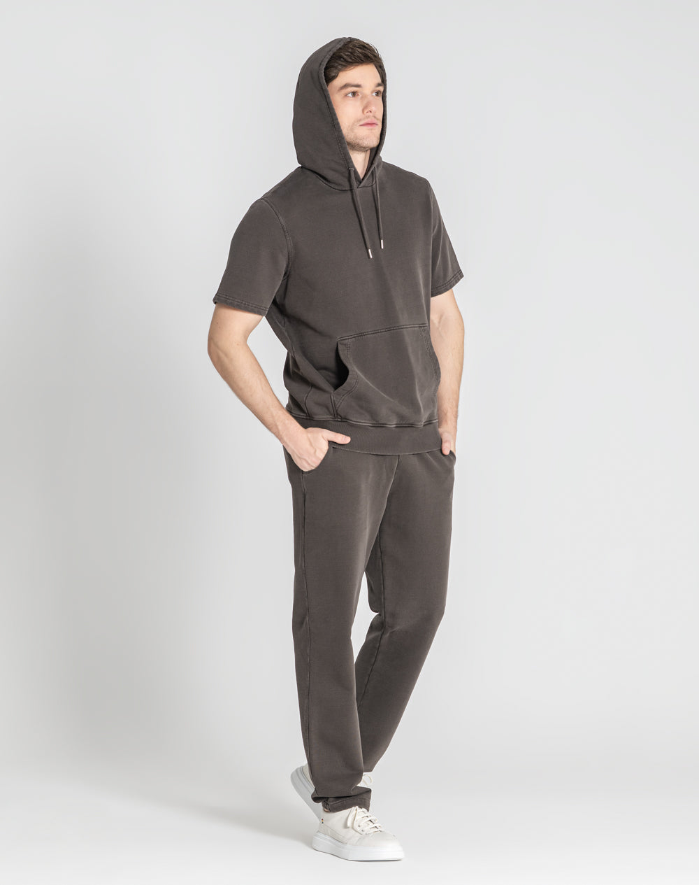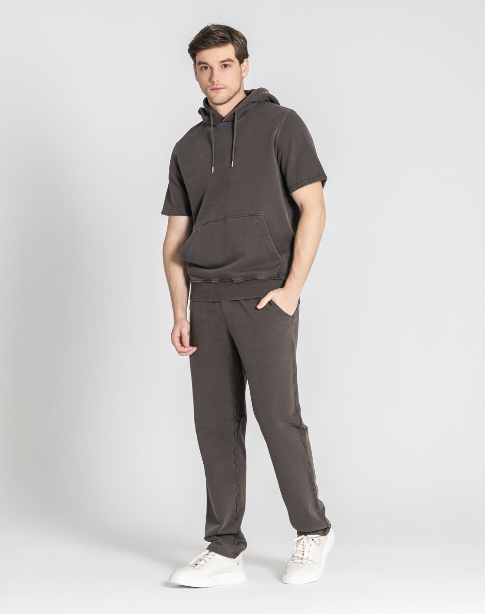 T-shirt de capuz com acabamento dye fast. T-shirt de manga curta com capuz e cordões. Interior do capuz na própria malha. Bolso de canguru na frente. Logótipo JEF bordado nas costas à cor da peça.