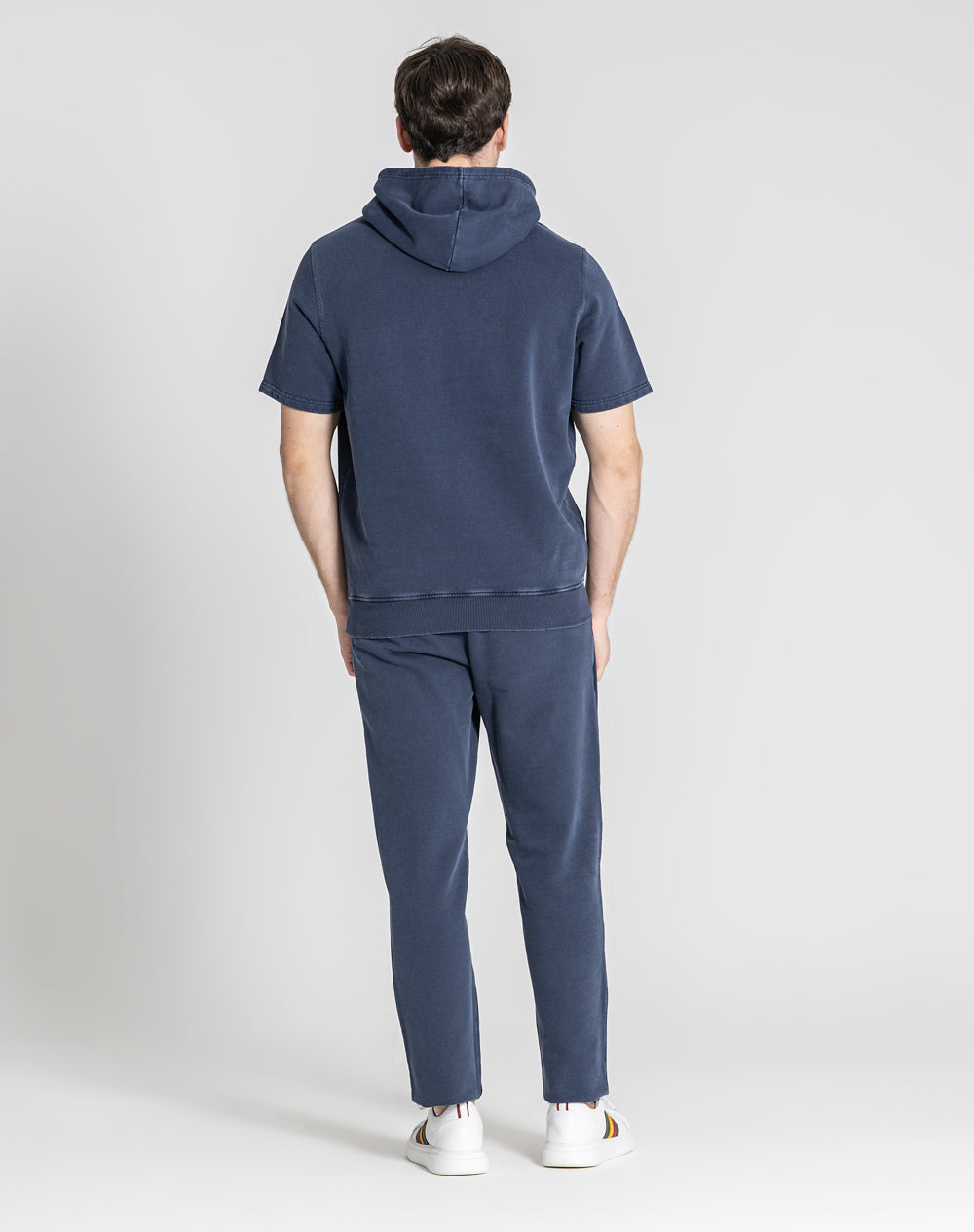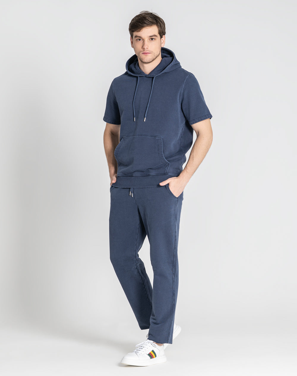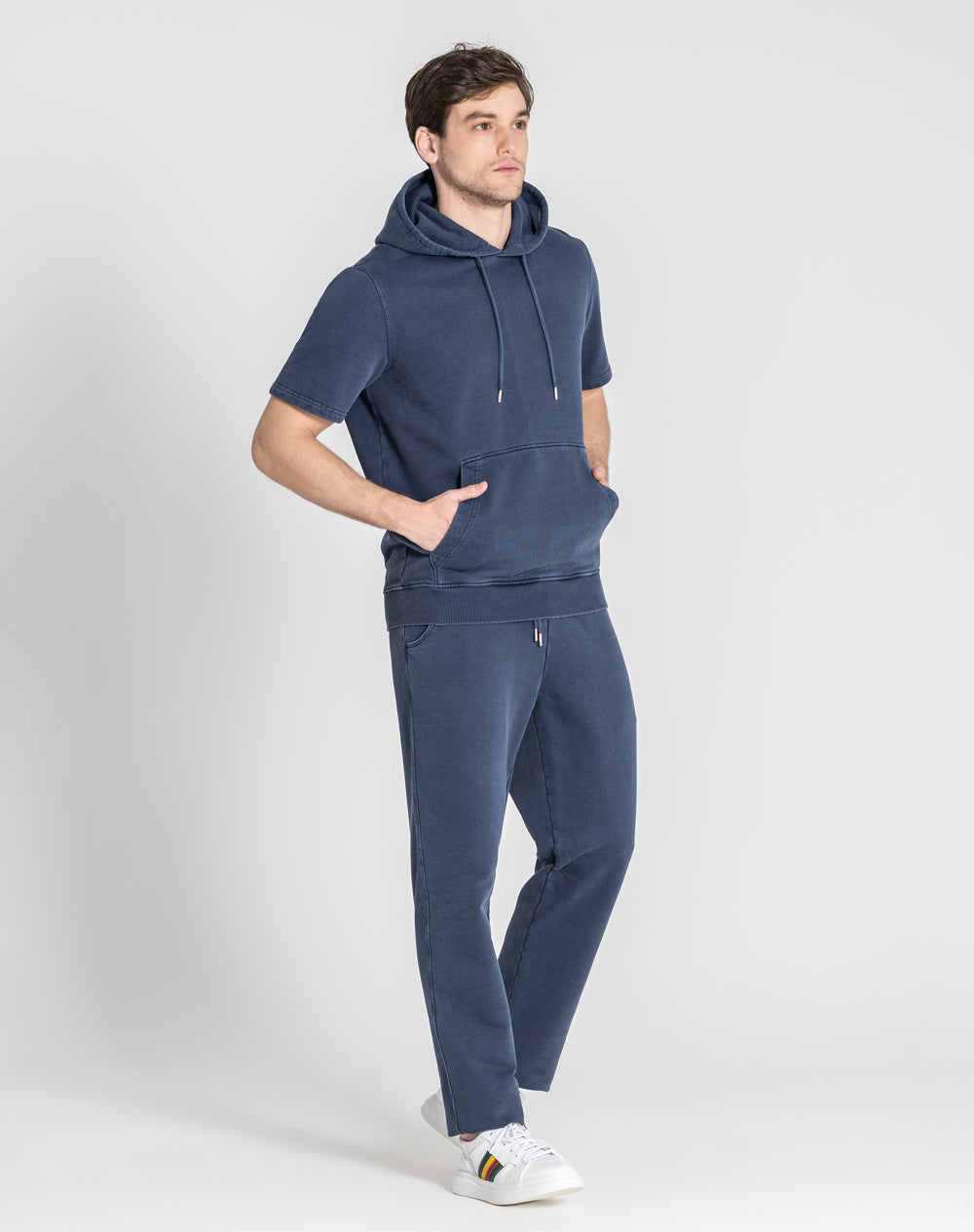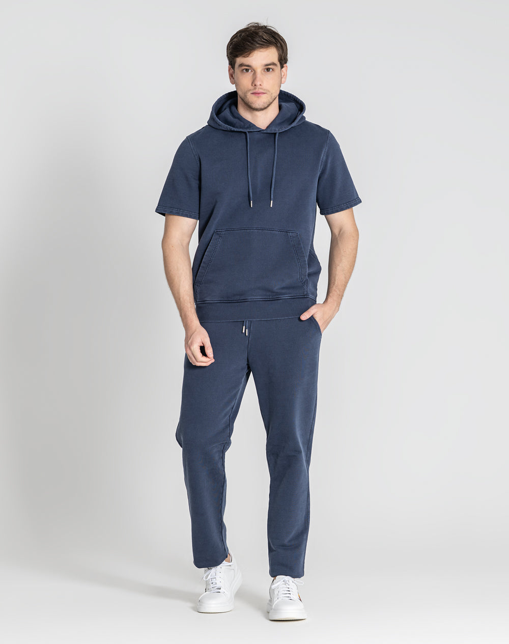 T-shirt de capuz com acabamento dye fast. T-shirt de manga curta com capuz e cordões. Interior do capuz na própria malha. Bolso de canguru na frente. Logótipo JEF bordado nas costas à cor da peça.