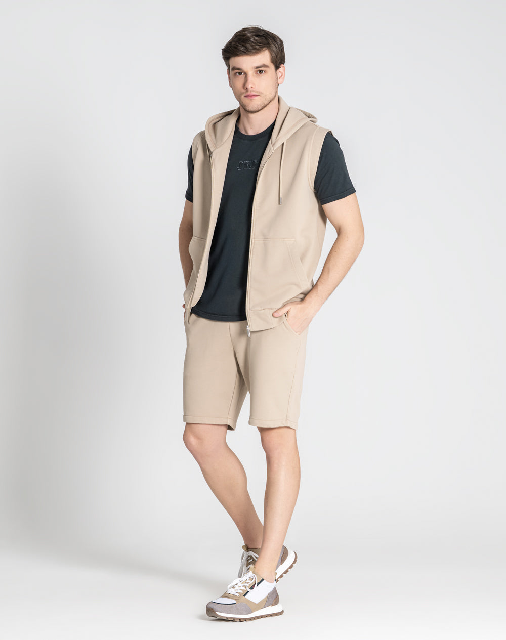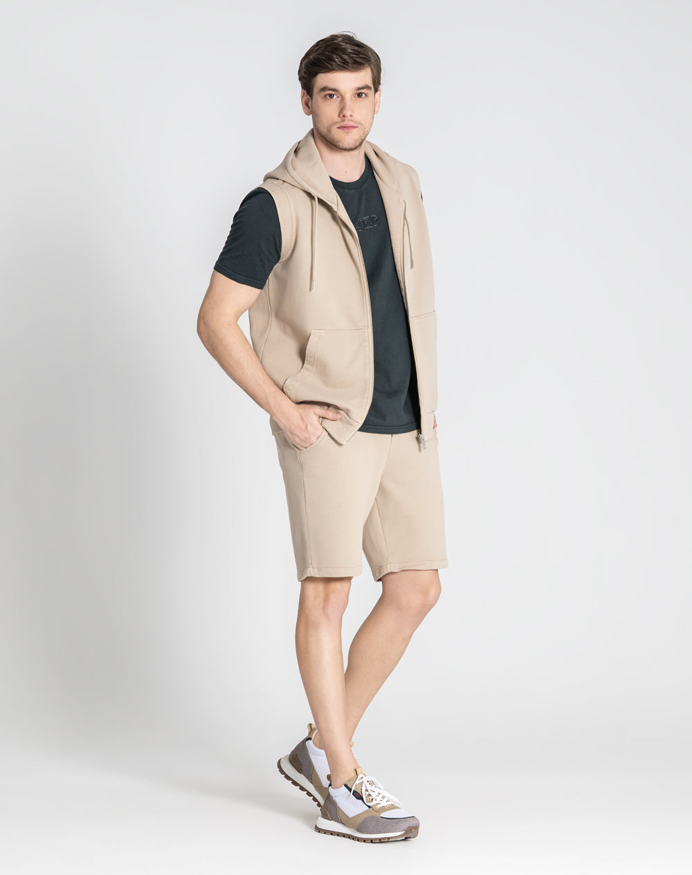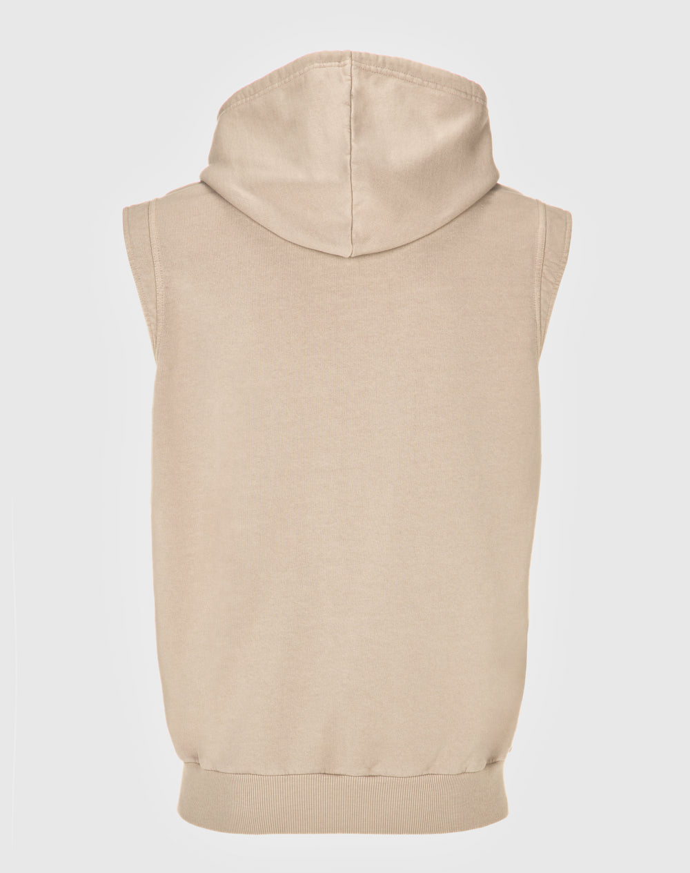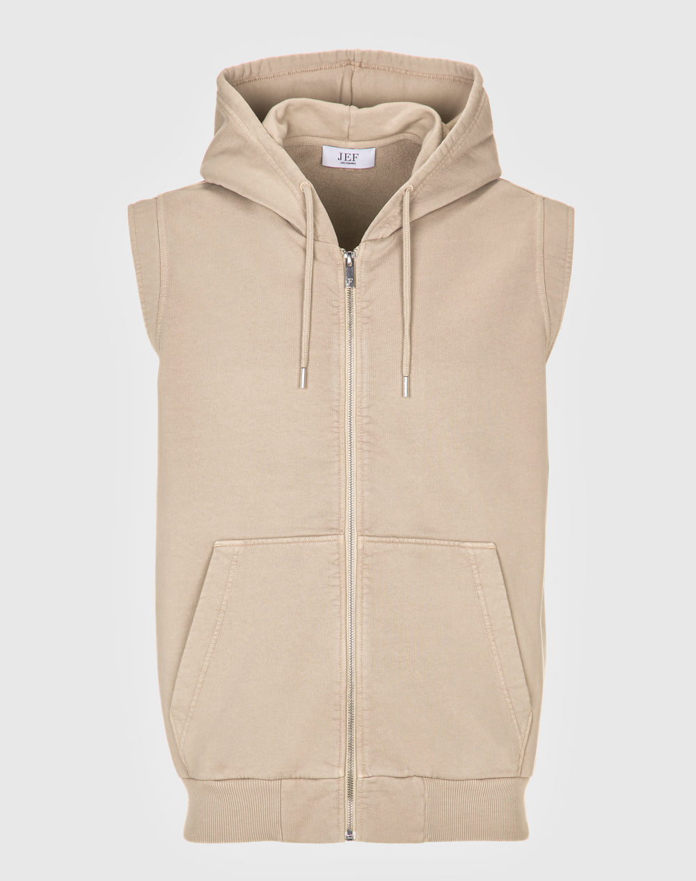 Colete com acabamento dye fast. Colete com capuz e cordões. Interior do capuz na própria malha. Bolso de canguru na frente. Abertura através de fecho metálico. Logótipo JEF bordado nas costas à cor da peça.