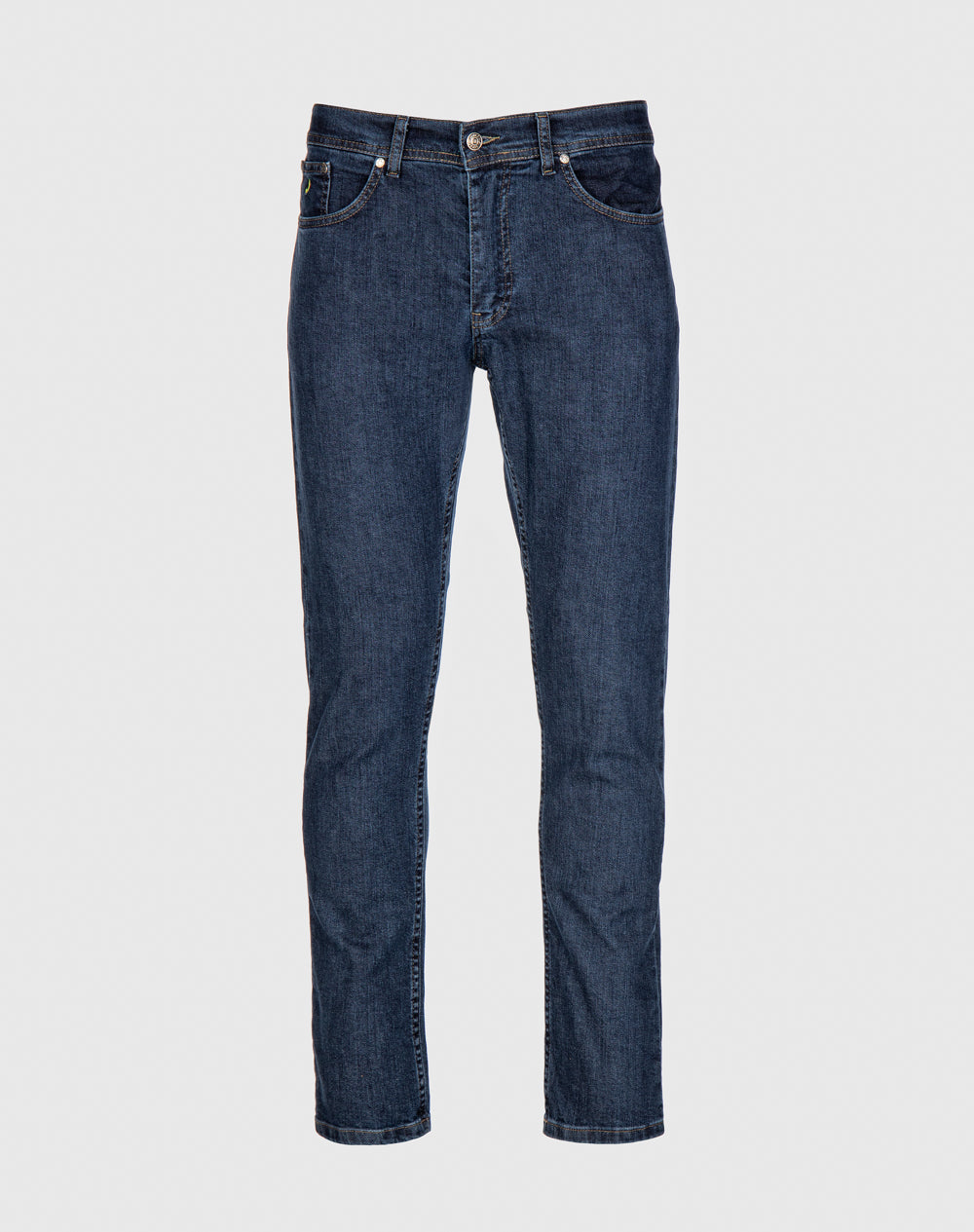 Calça regular em denim com cintura média. Estilo com cinco bolsos. Um botão de prego e fecho interior no meio frente. Bolsos redondos nas laterais da frente com rebites. Bolso pequenino sobreposto no interior do bolso redondo com logótipo bordado com cores da marca. Bolsos regulares nas costas com pesponto duplo. Etiqueta no bolso direito na lateral. Escapulário nas costas com pesponto duplo. Cinto com etiqueta em pele com gravação do “JEF”. Forro interior com logótipos da marca.