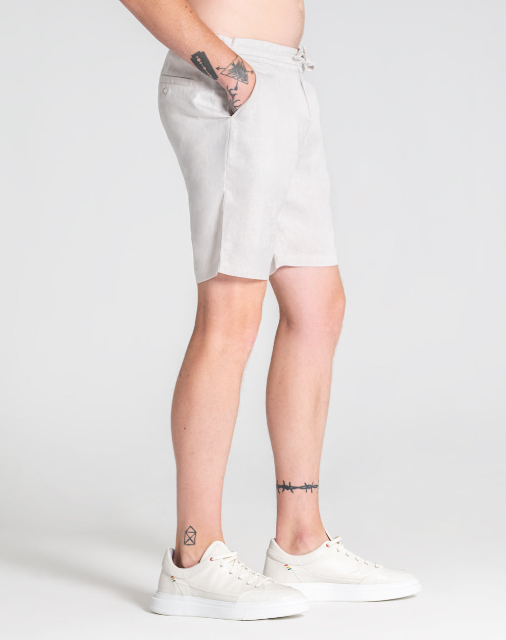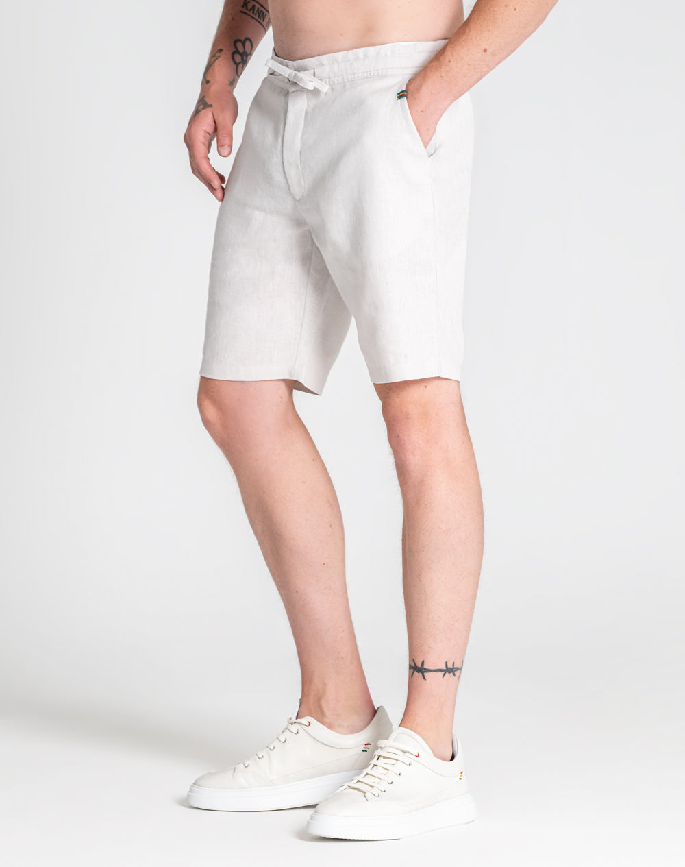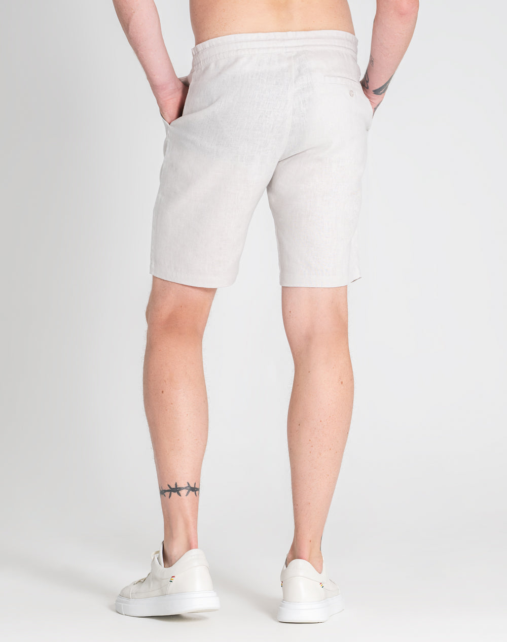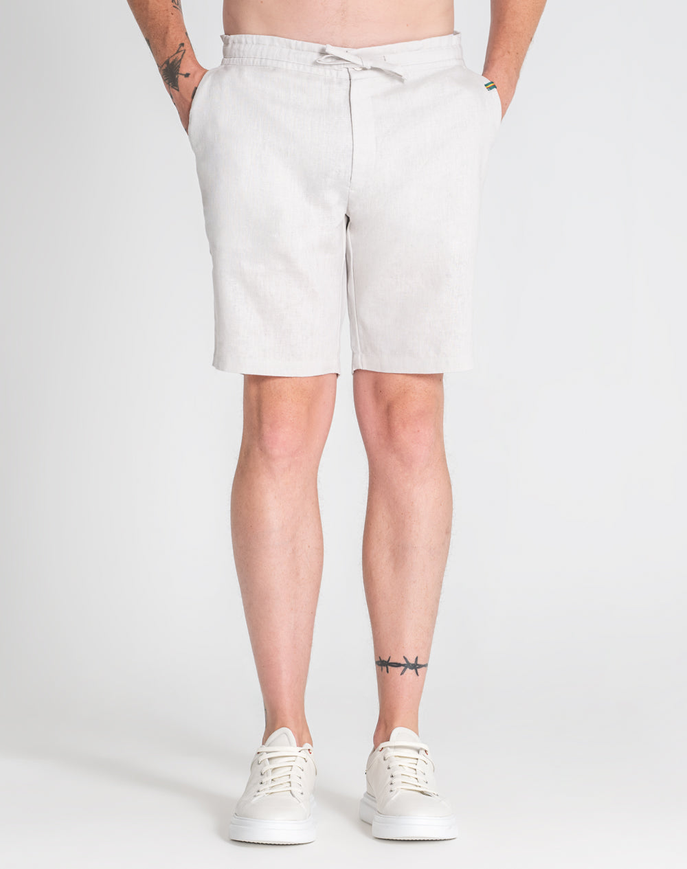 Calções de linho descontraídos. Bolsos de faca nas laterais. Bolso de vivo com botão nas costas. Logótipo da marca bordado à cor da peça. Fita de nastro com as cores da marca.