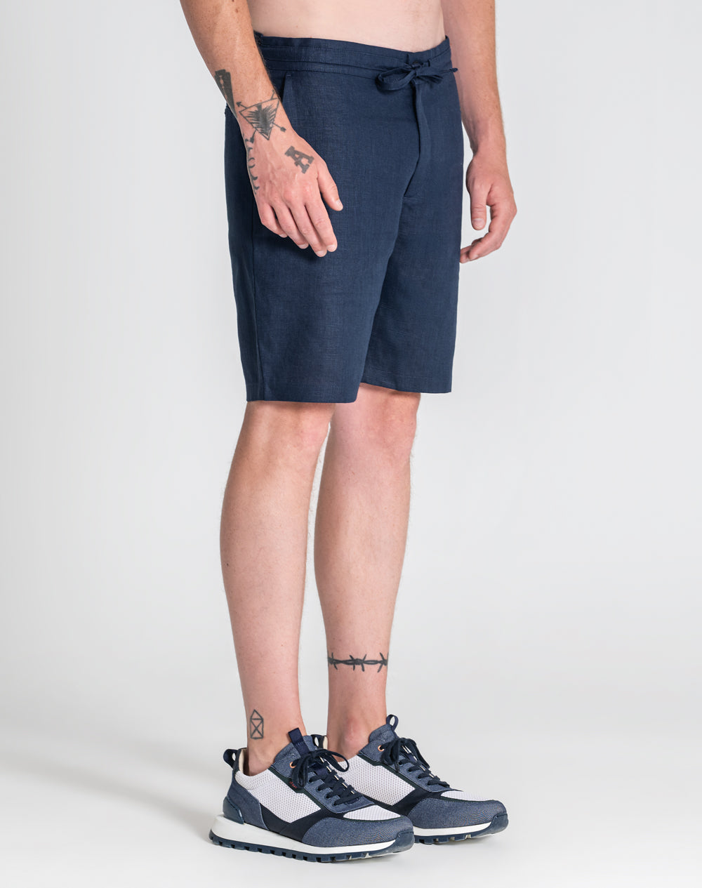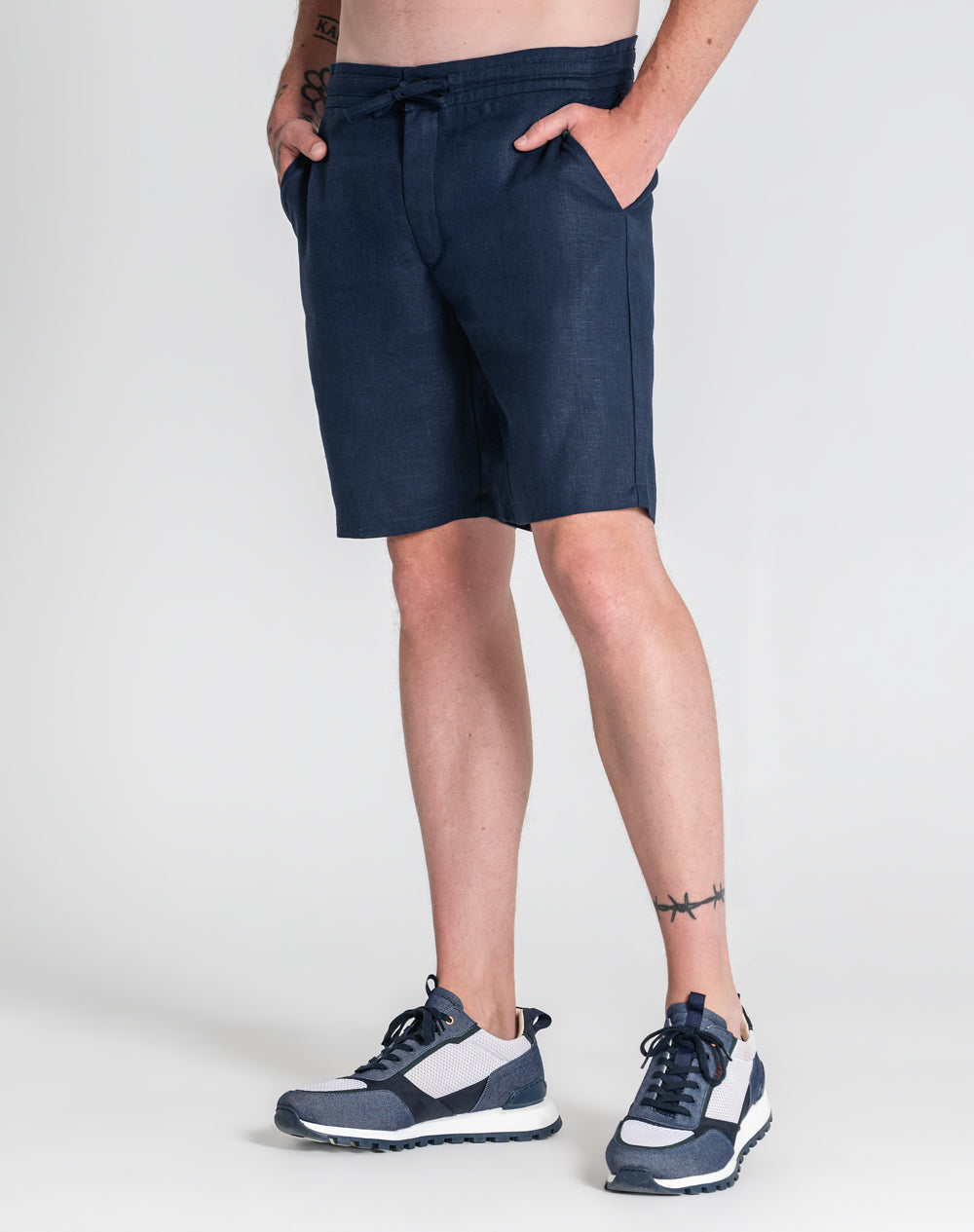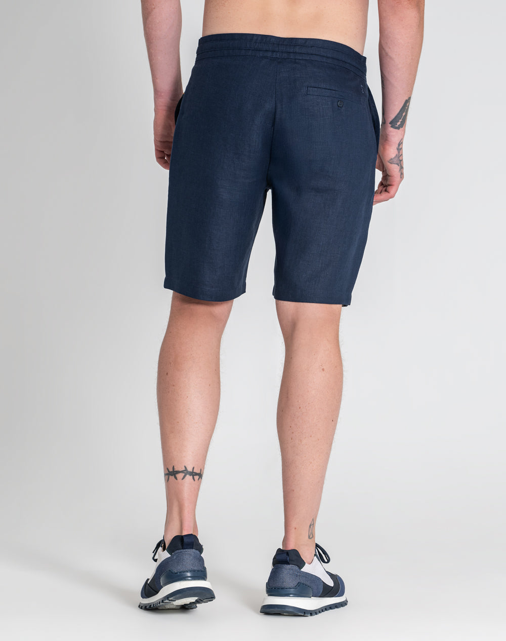 Calções de linho descontraídos. Bolsos de faca nas laterais. Bolso de vivo com botão nas costas. Logótipo da marca bordado à cor da peça. Fita de nastro com as cores da marca.