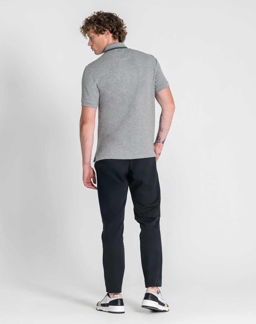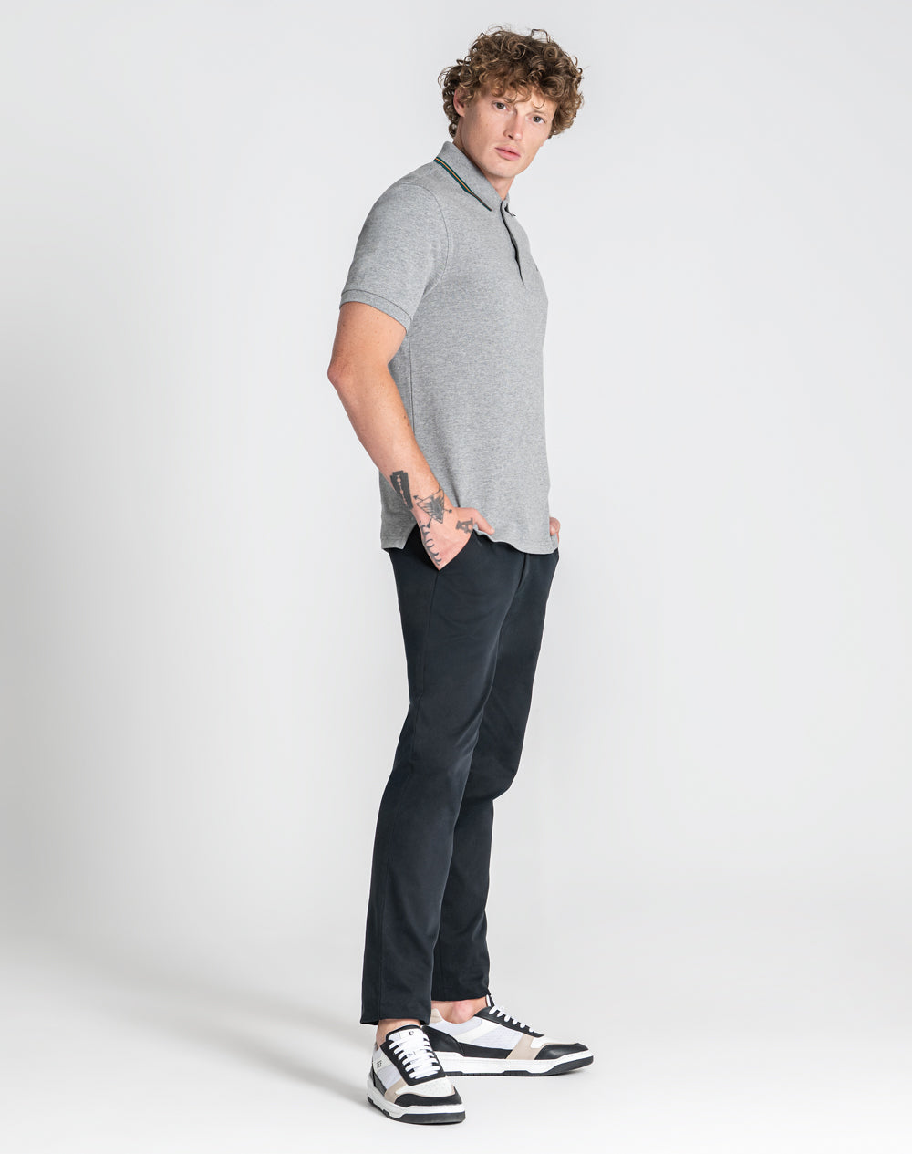 Polo manga curta em algodão. Gola com riscas das cores da marca. Logótipo ícone da marca bordado à cor da peça na frente. Abotoado por 3 botões no meio frente. Meia-lua na própria malha com logótipo JEF bordado nas costas à cor da peça. Pequenas rachas nas laterais.