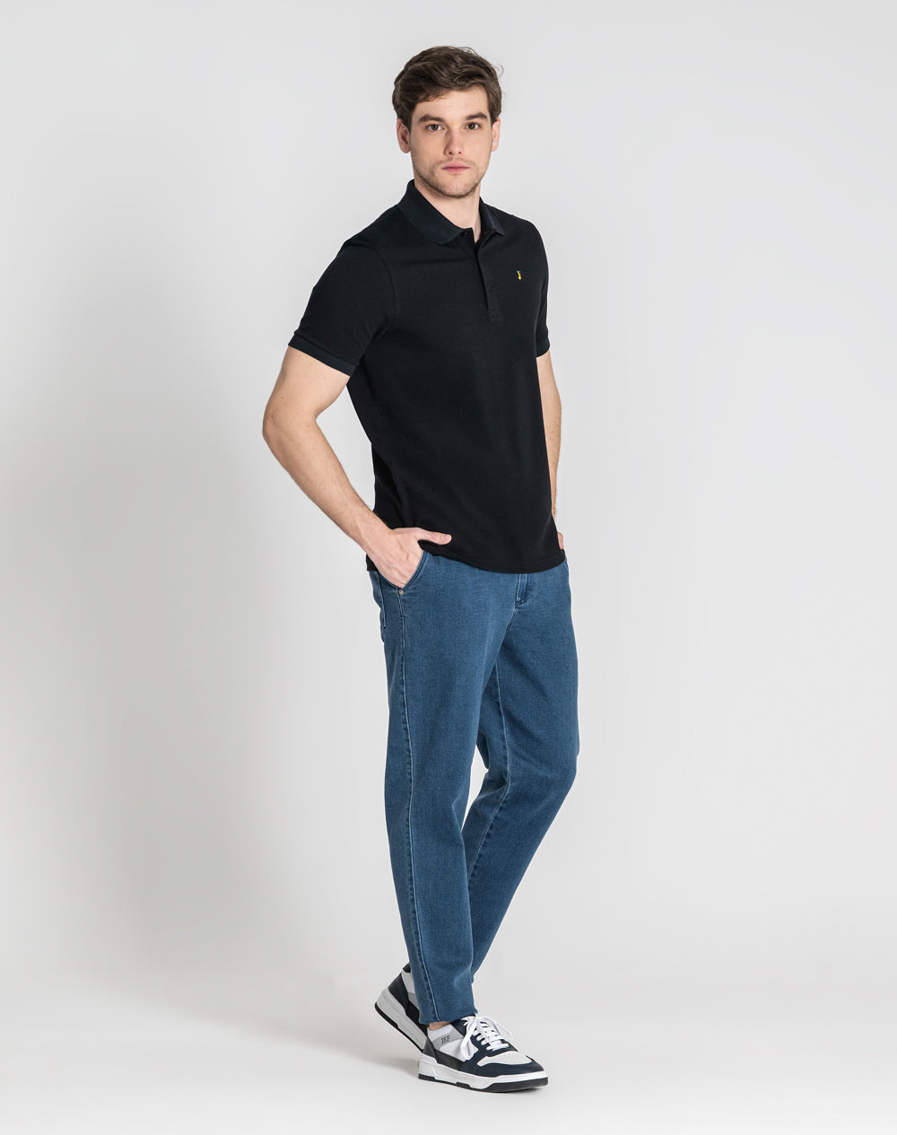 Polo manga curta em algodão. Logótipo ícone da marca bordado com as cores da marca na frente. Abotoado por 3 botões no meio frente. Logótipo JEF bordado nas costas à cor da peça. Pequenas rachas nas laterais.