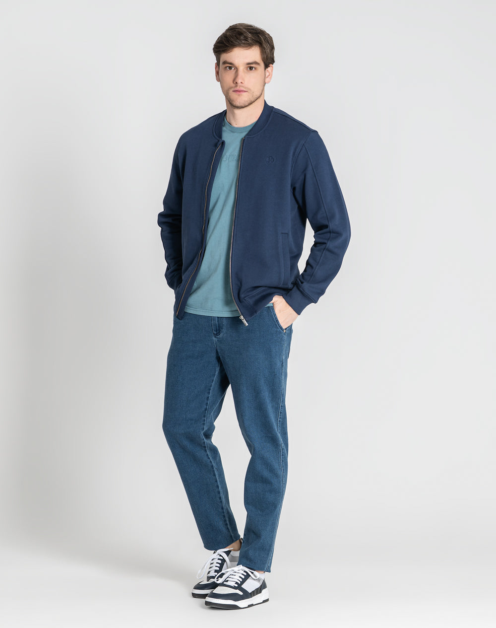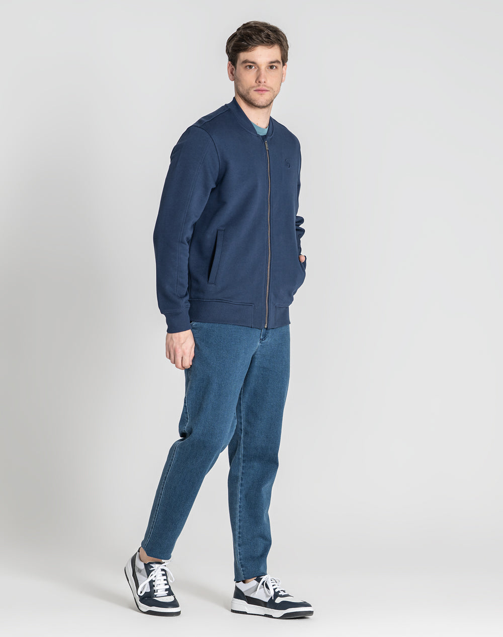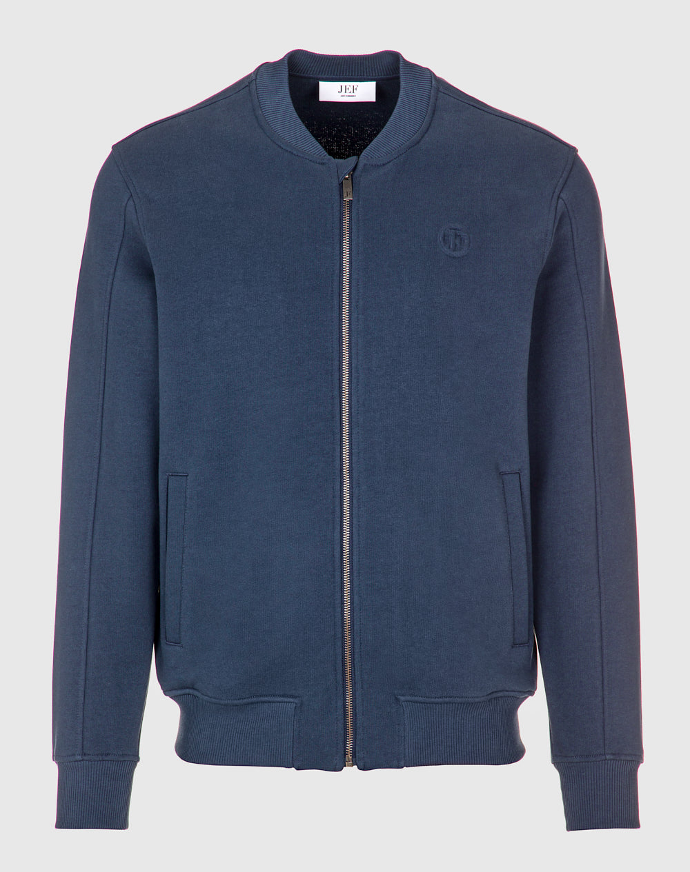 Bomber em felpa 100% algodão orgânico. Abertura através de fecho metálico. Bolsos de vivo nas laterais. Logótipo da marca através da técnica embossed 3D. Gola, punhos e cinto em rib.