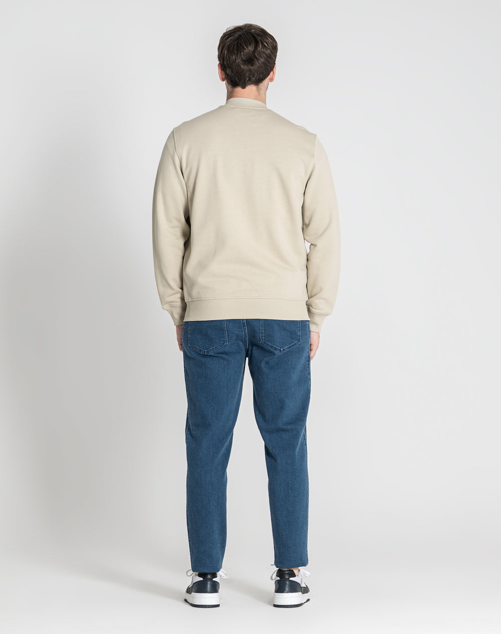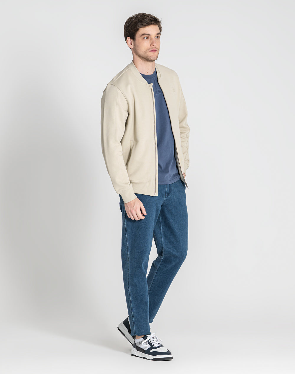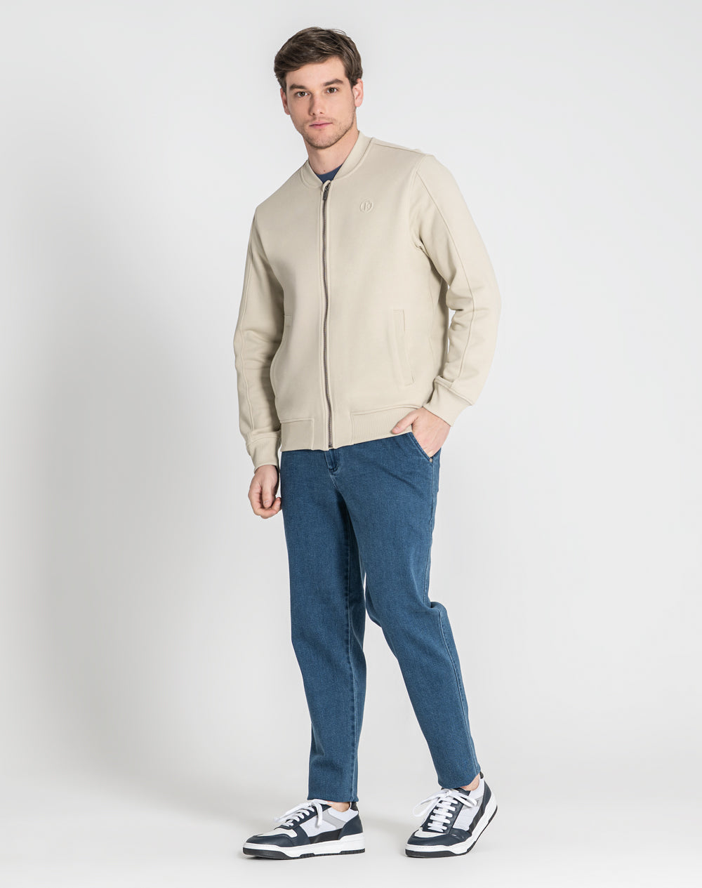 Bomber em felpa 100% algodão orgânico. Abertura através de fecho metálico. Bolsos de vivo nas laterais. Logótipo da marca através da técnica embossed 3D. Gola, punhos e cinto em rib.
