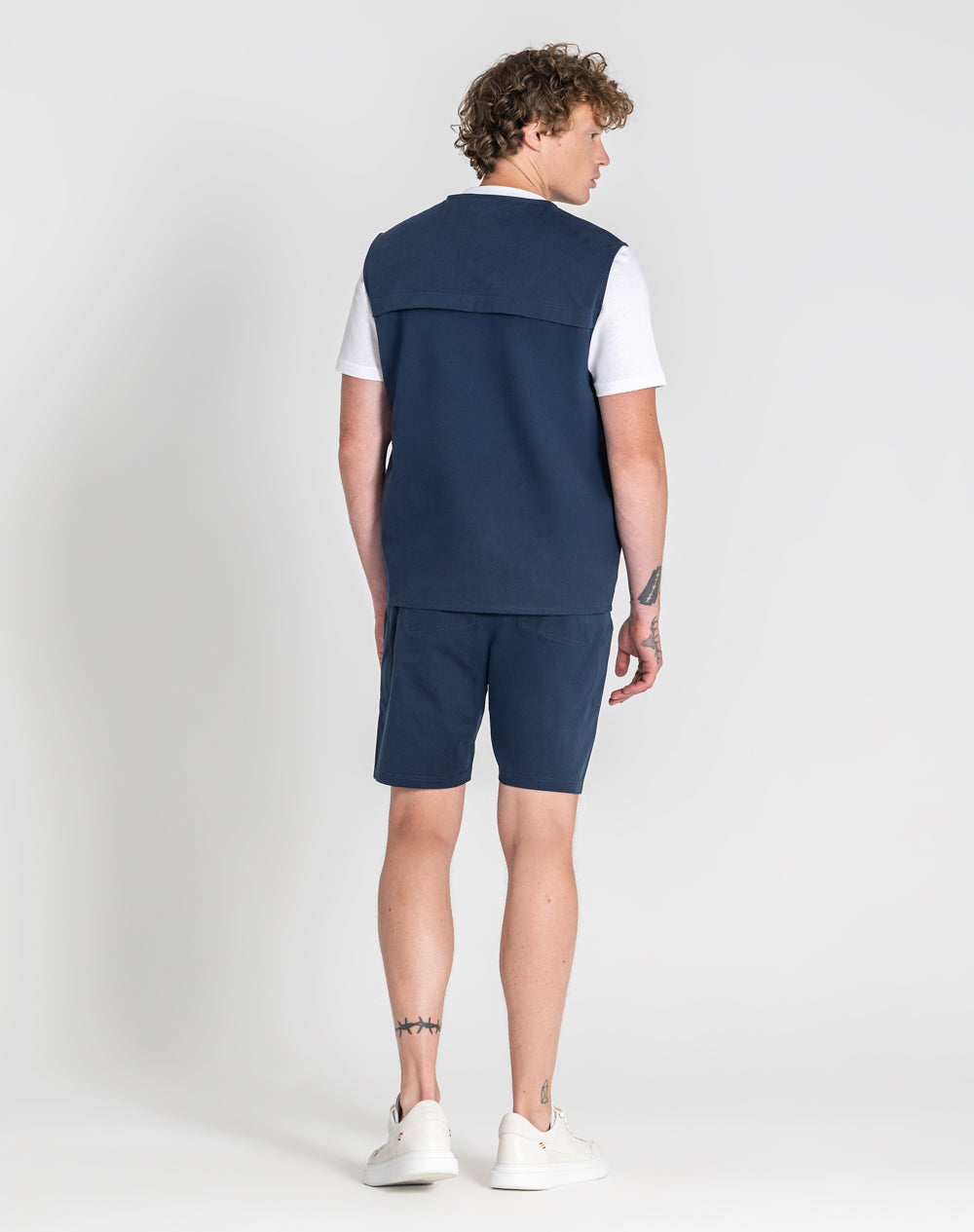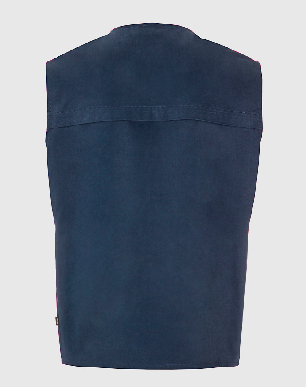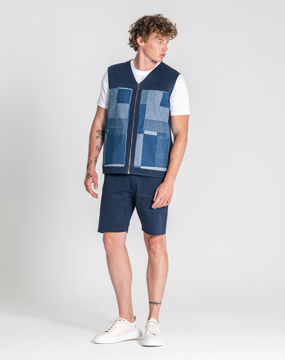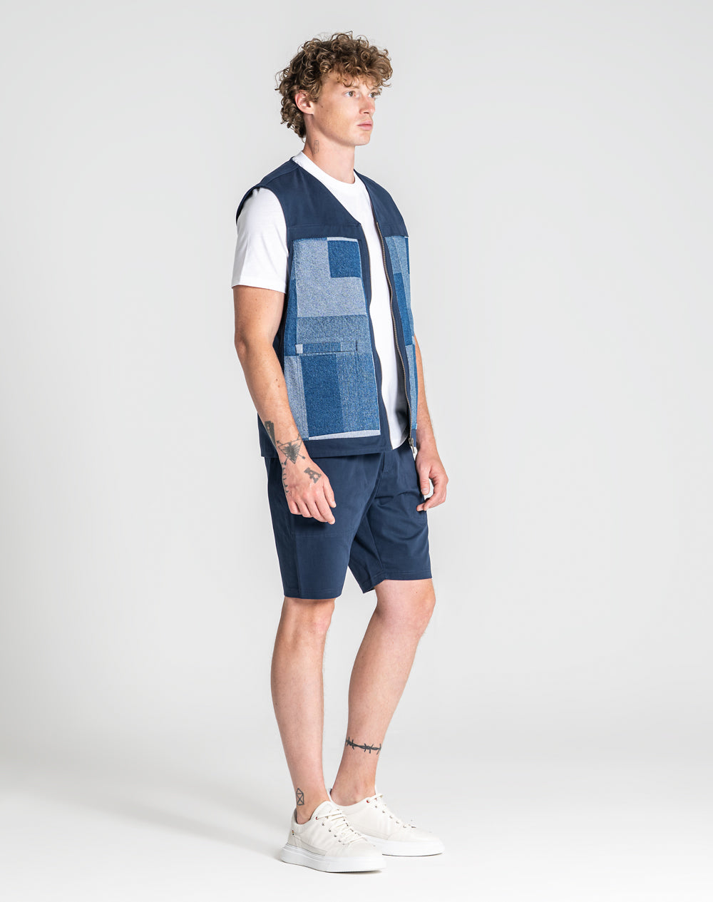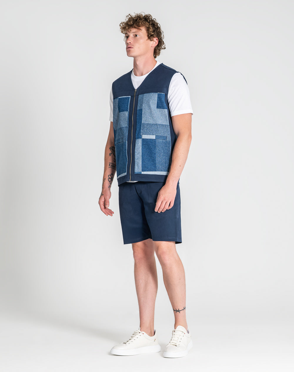 Colete com bolsos em patchwork. Decote em V. Abertura através de fecho metálico. Bolsos de chapa. Escapulário frente e costas. Etiqueta JEF na vertical metida na costura lateral.