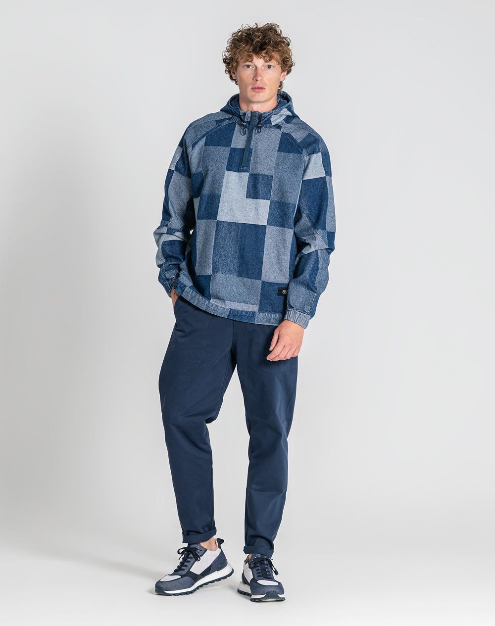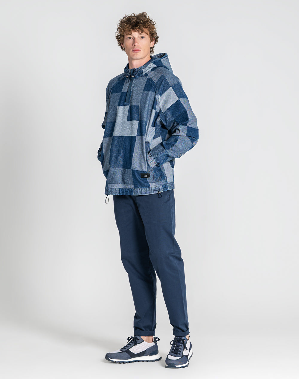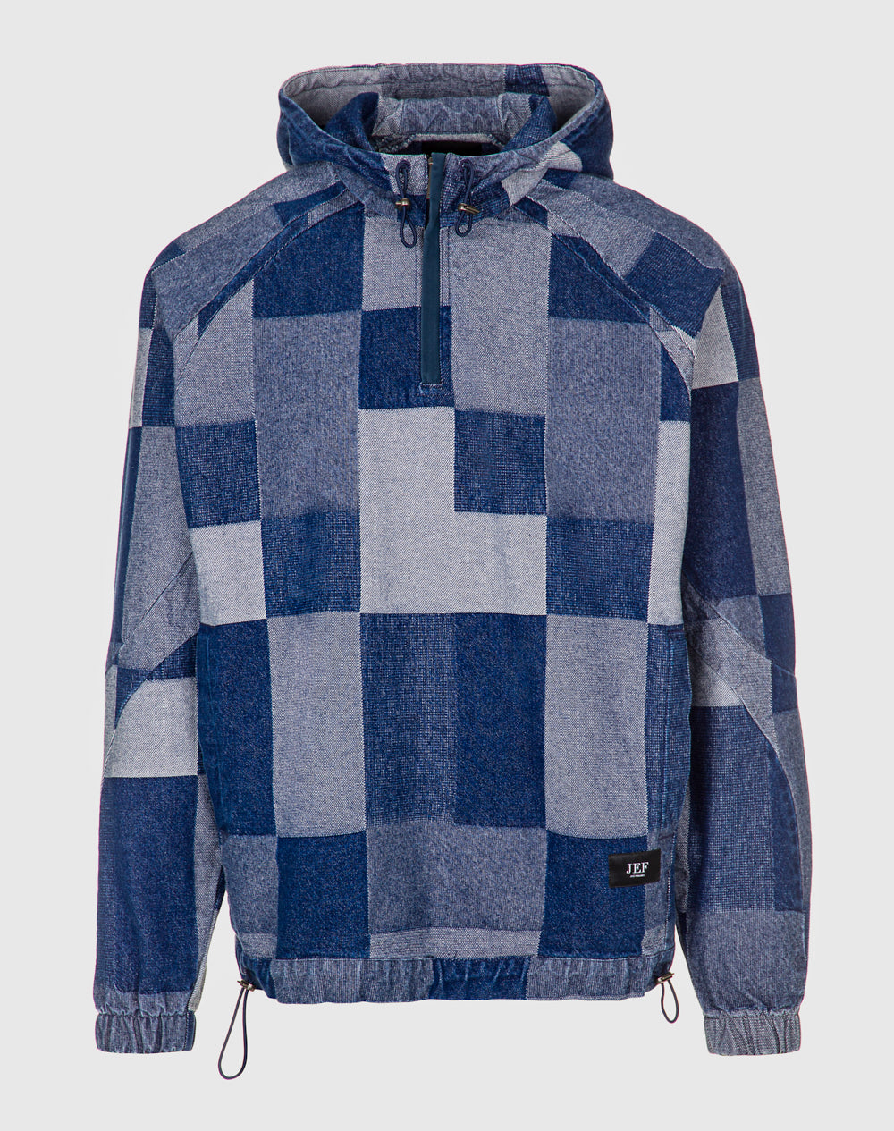 Anorak patchwork 100% algodão orgânico. Abertura meio-frente através de fecho metálico. Bolsos laterais metidos na costura. Etiqueta JEF pregada na frente canto inferior. Reguladores no capuz e cinto para ajuste.