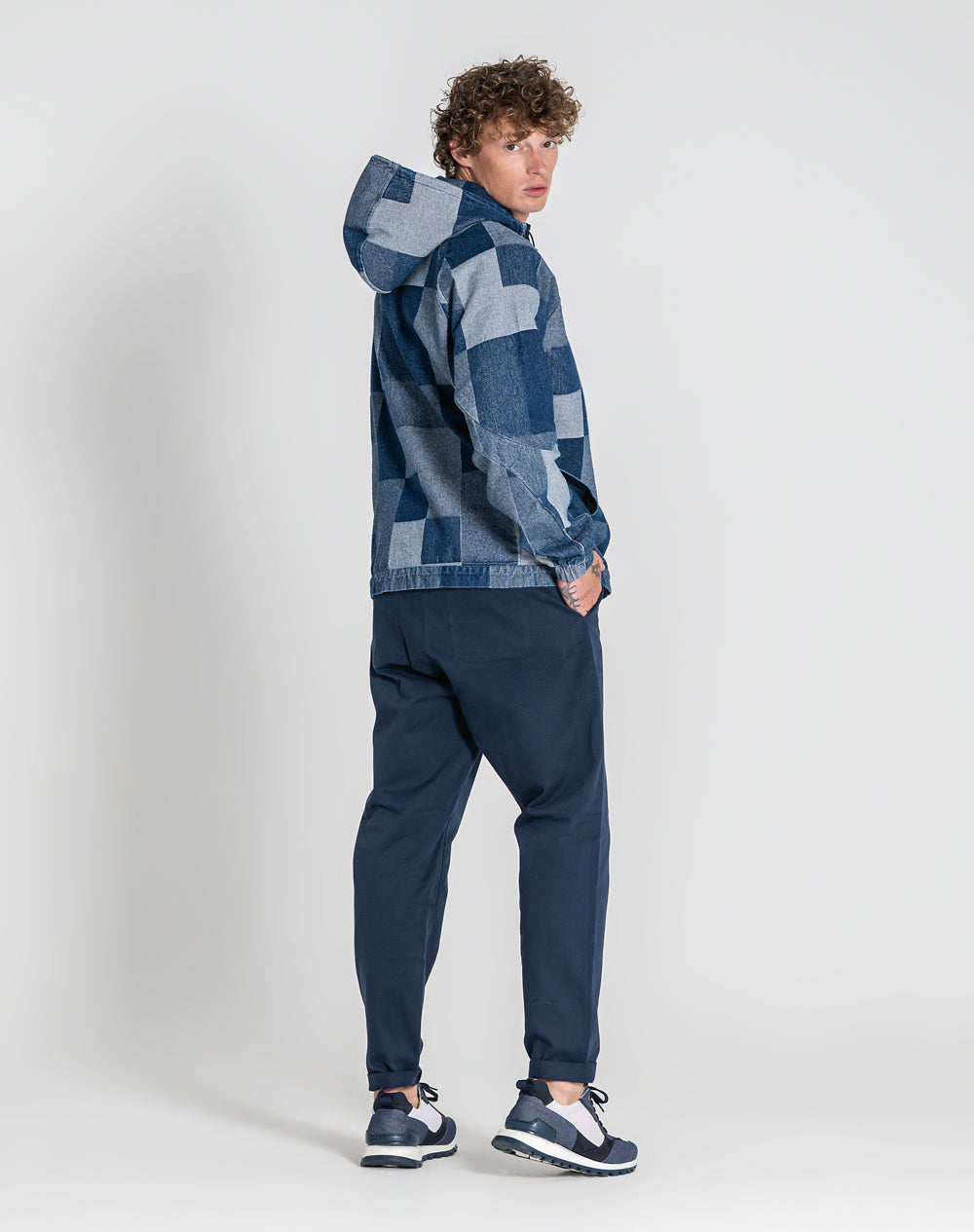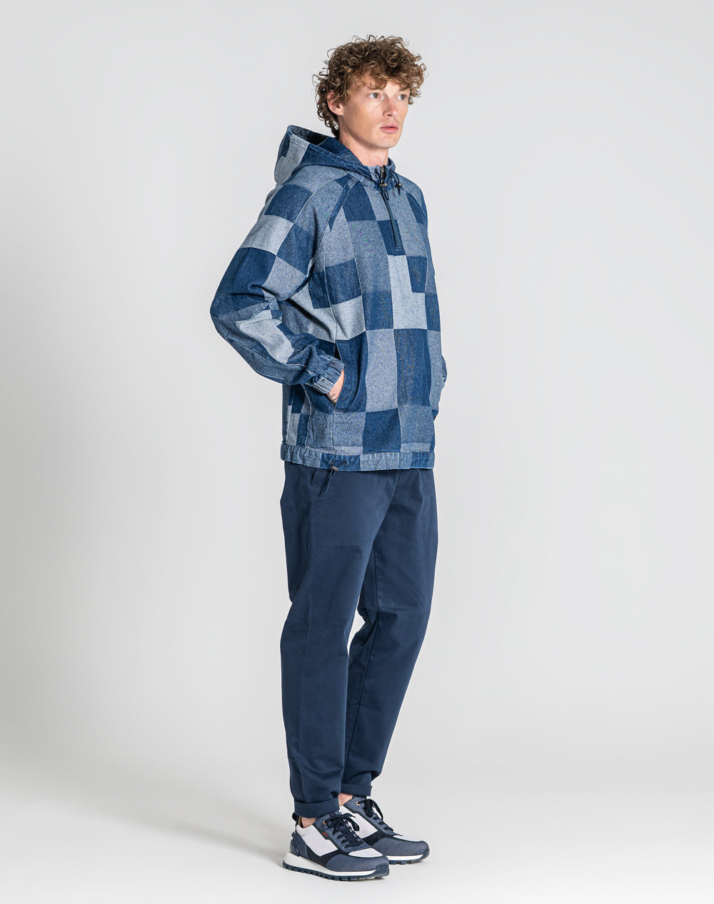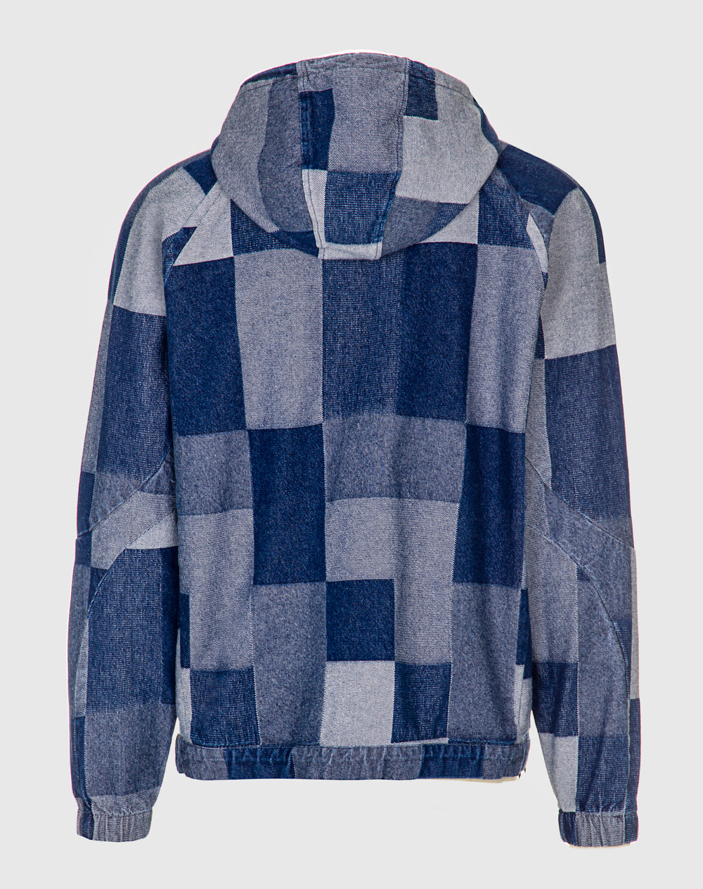 Anorak patchwork 100% algodão orgânico. Abertura meio-frente através de fecho metálico. Bolsos laterais metidos na costura. Etiqueta JEF pregada na frente canto inferior. Reguladores no capuz e cinto para ajuste.