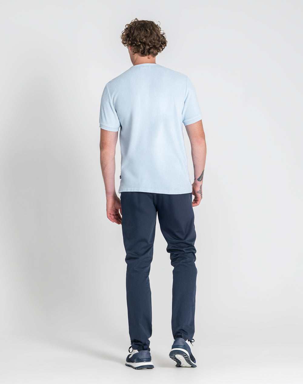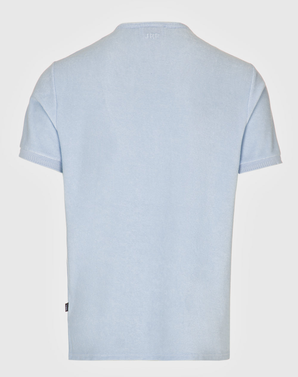 Polo de manga curta em peluche. Gola mandarim. Logótipo JEF da marca bordado à cor da peça nas costas. Abotoado por 3 botões no meio frente. Etiqueta preta JEF na vertical metida na costura lateral. Punhos das mangas com desenho.