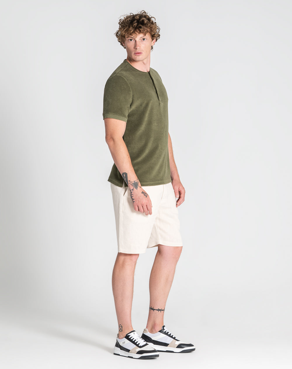 Polo de manga curta em peluche. Gola mandarim. Logótipo JEF da marca bordado à cor da peça nas costas. Abotoado por 3 botões no meio frente. Etiqueta preta JEF na vertical metida na costura lateral. Punhos das mangas com desenho.