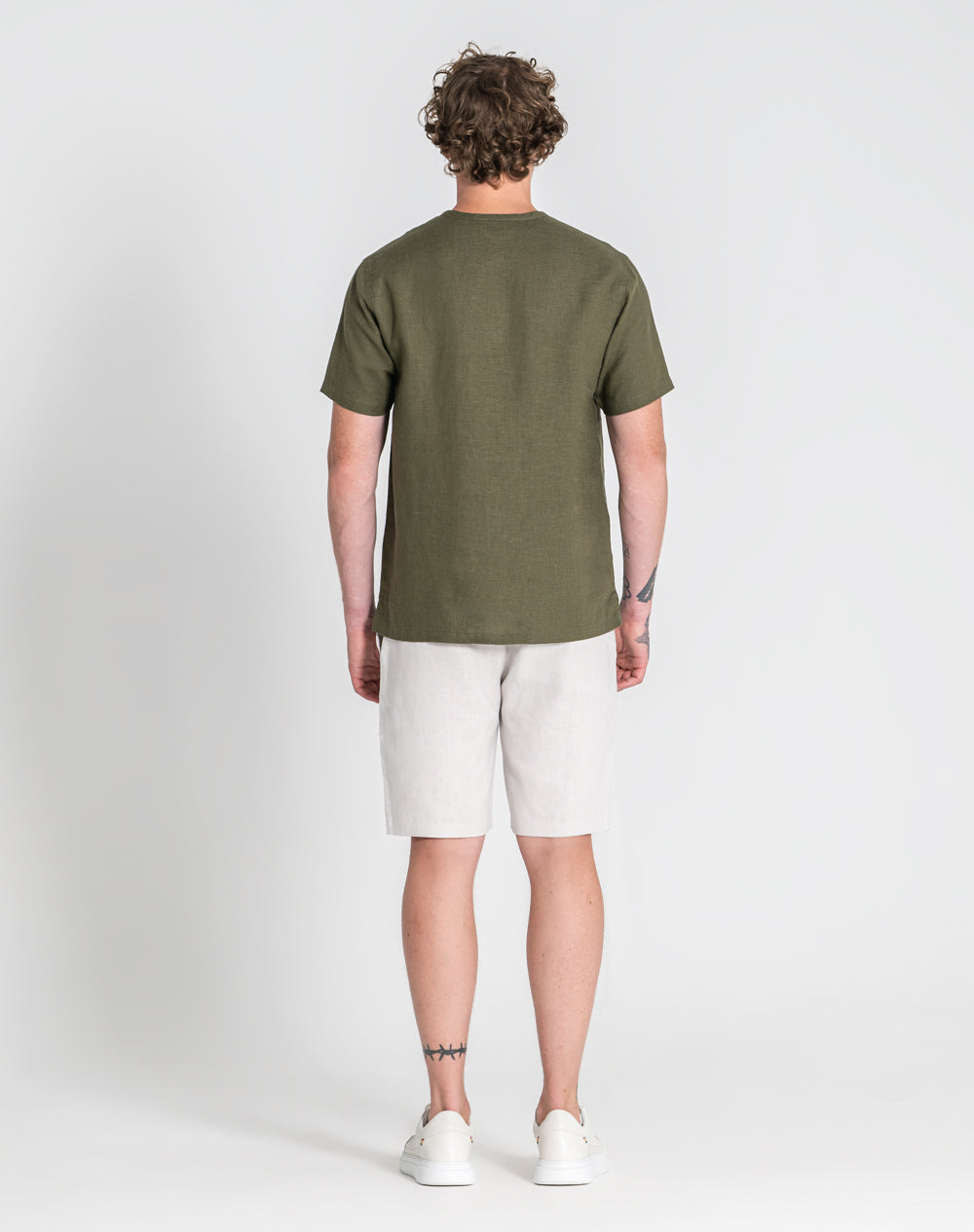 T-shirt de manga curta em 100% linho. Abertura através de 3 botões. Logótipo ícone da marca bordado à cor da peça.