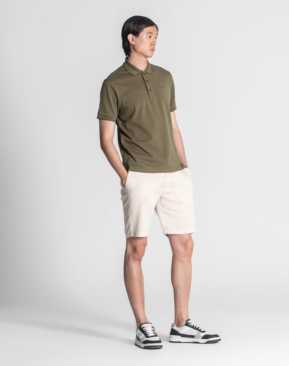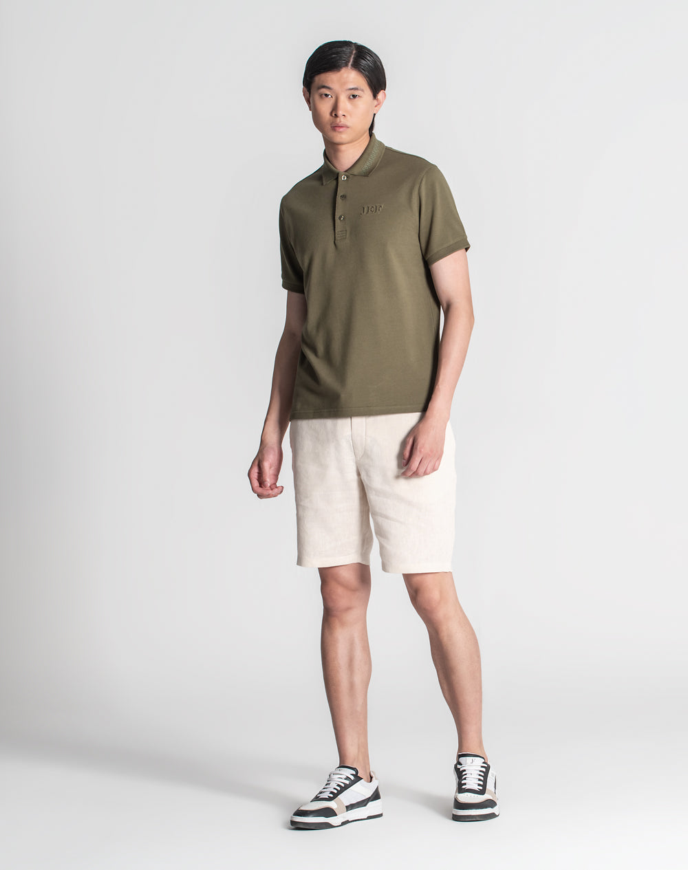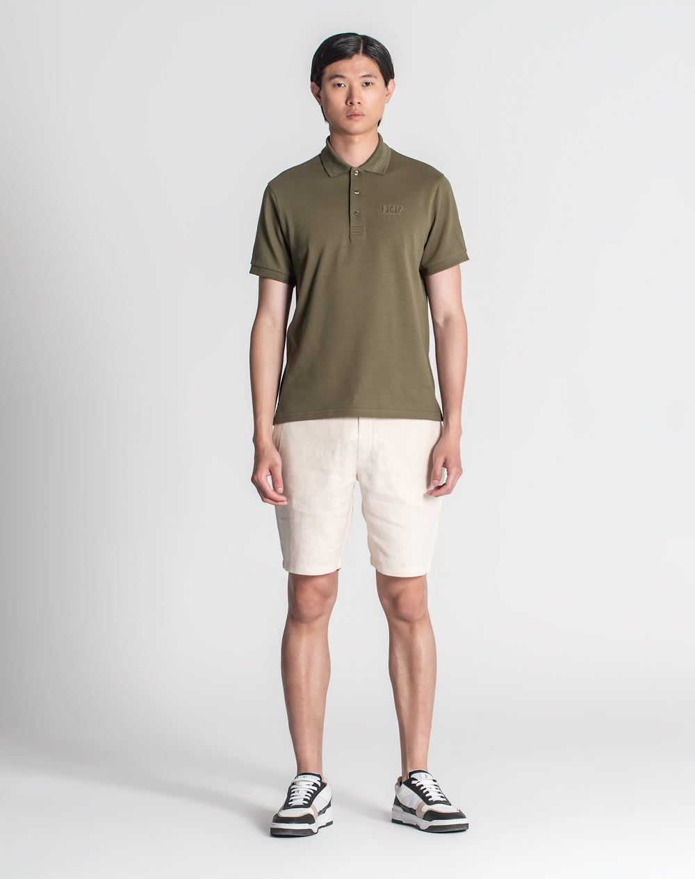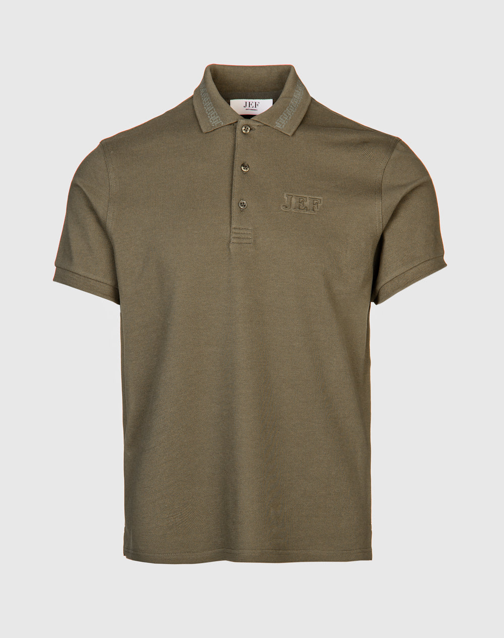 Polo manga curta em algodão. Logótipo JEF através da técnica embossed 3D na frente. Abotoado por 3 botões no meio frente. Pequenas rachas nas laterais.