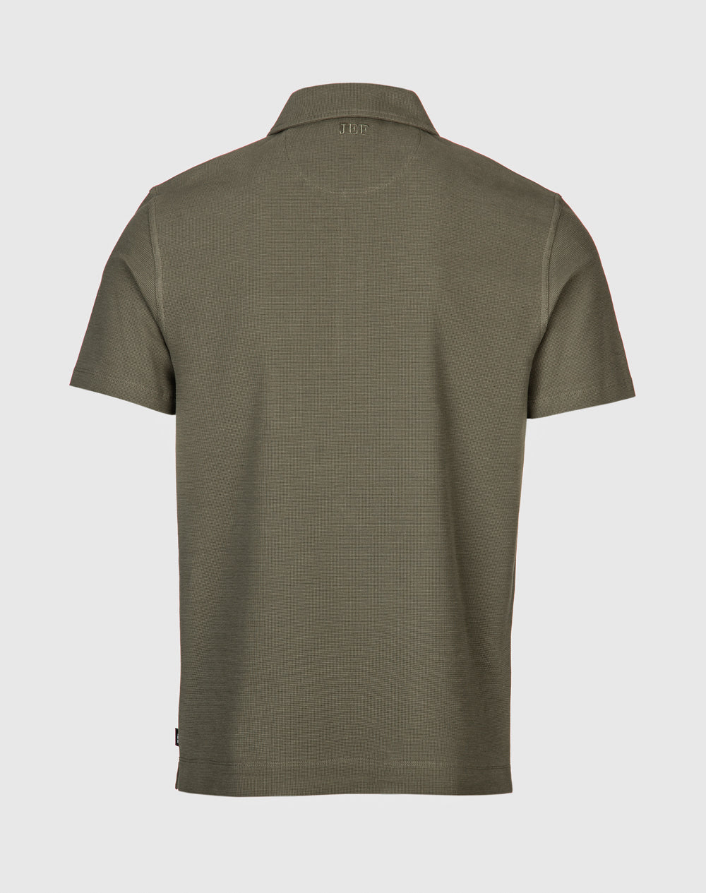 Polo de manga curta em algodão. Abotoado por 3 botões no meio frente, mas apenas com 1 visível. Bolso superior de pala com efeito chapa através de pesponto duplo. Meia lua em tecido estampado com logótipo JEF bordado à cor da peça nas costas. Etiqueta JEF preta na vertical metida na costura lateral. Pequenas rachas nas laterais.