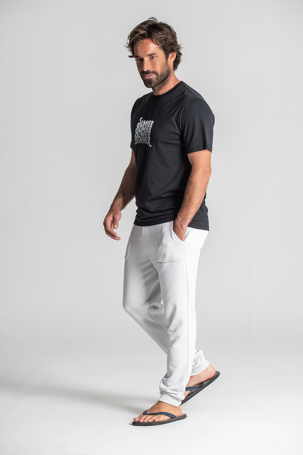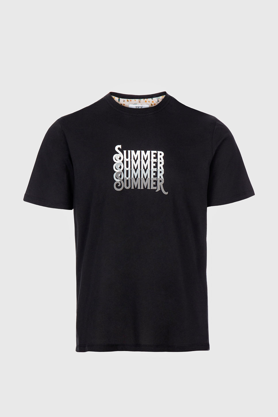 T-shirt em jersey SUPIMA com decote redondo. Meia-lua em tecido estampado alusivo ao tema da coleção. SUMMER em degradê através de estampado com relevo. Recobrimento 3 agulhas no fundo, manga e gola.