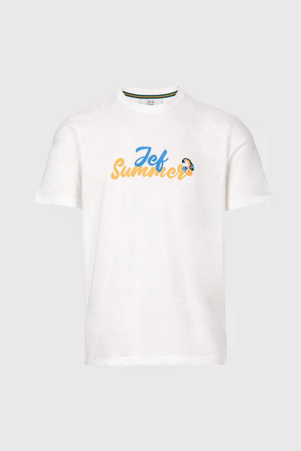 T-shirt em jersey orgânico com decote redondo. Tapa-costuras com cores da marca. JEF SUMMER através de estampado e transfer com relevo.