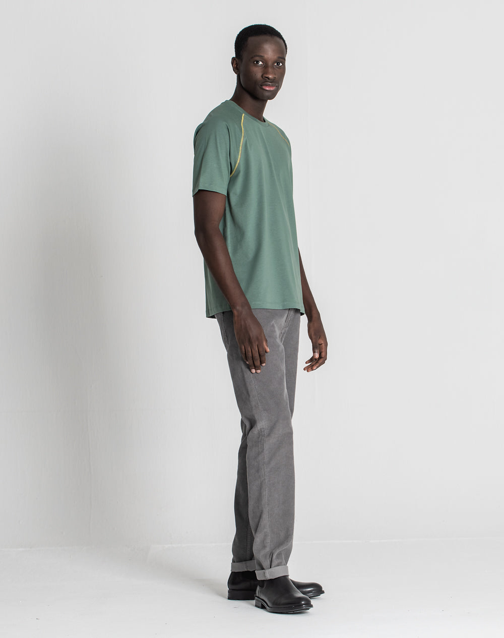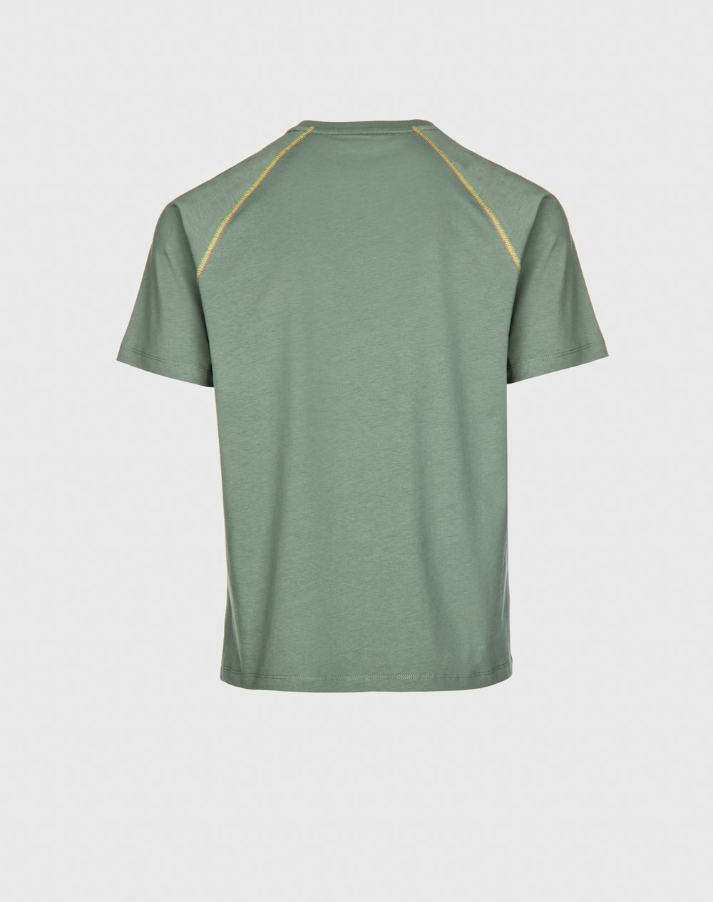 T-shirt com decote redondo. Manga raglan. Recobrimento nas cavas com as cores da marca. Tapa-costuras com as cores da marca.