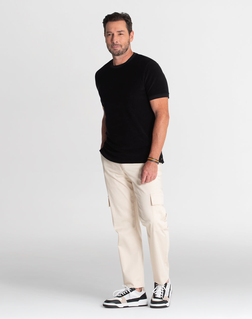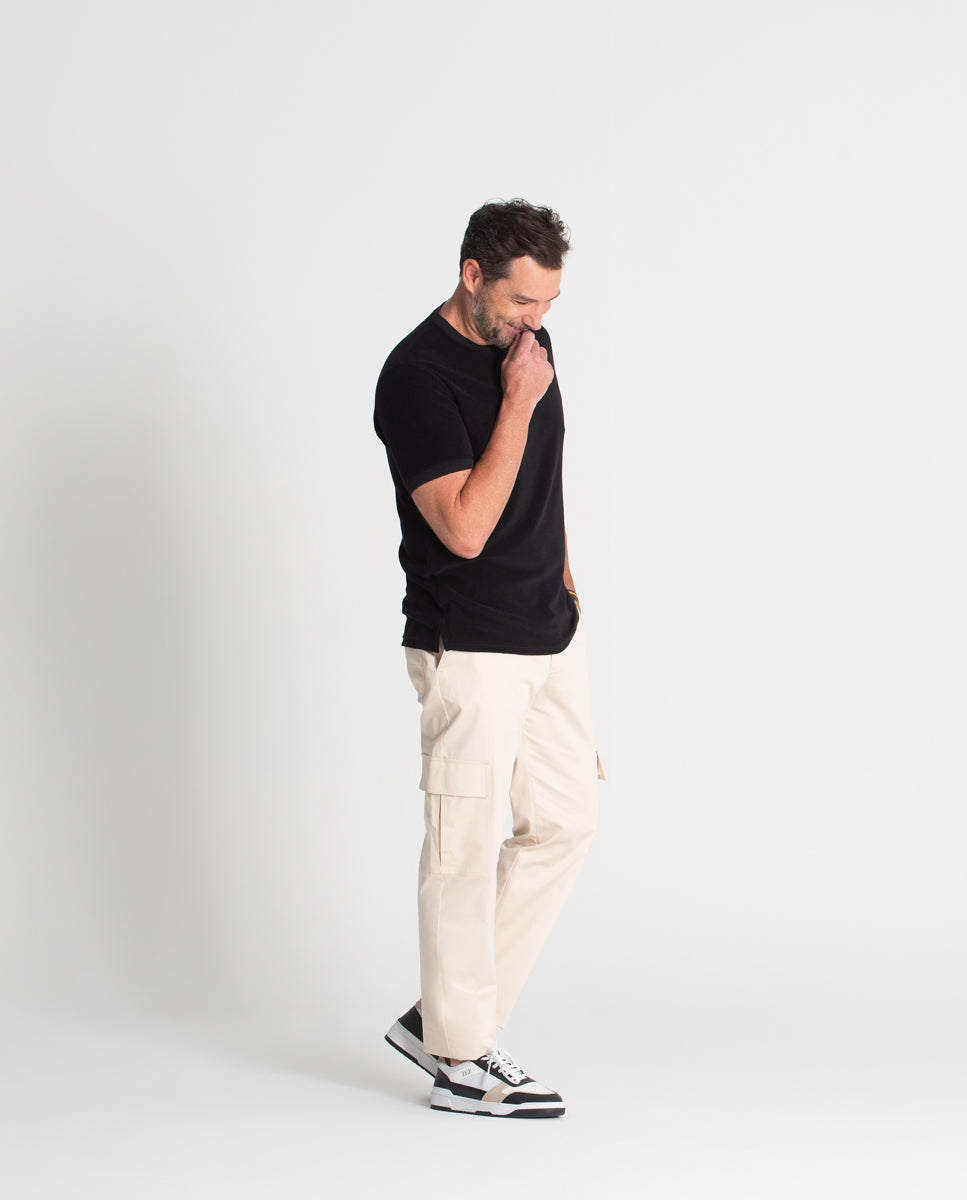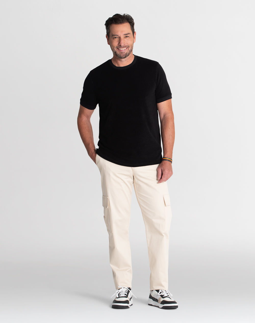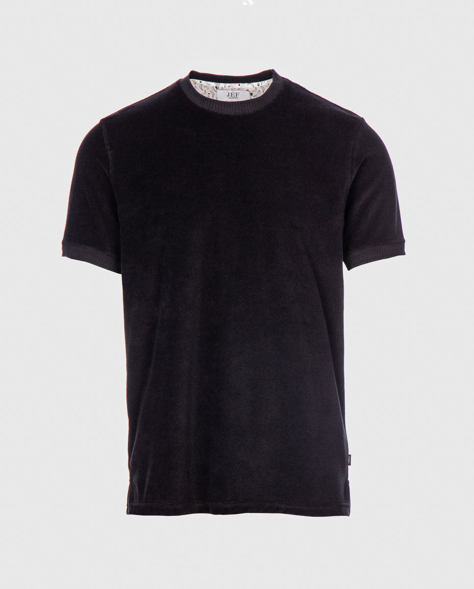 T-shirt em peluche com gola redonda. Pequenas rachas laterais. Meia-lua em tecido estampado (popelina orgânica com acabamento seda) alusivo ao conceito da coleção.
