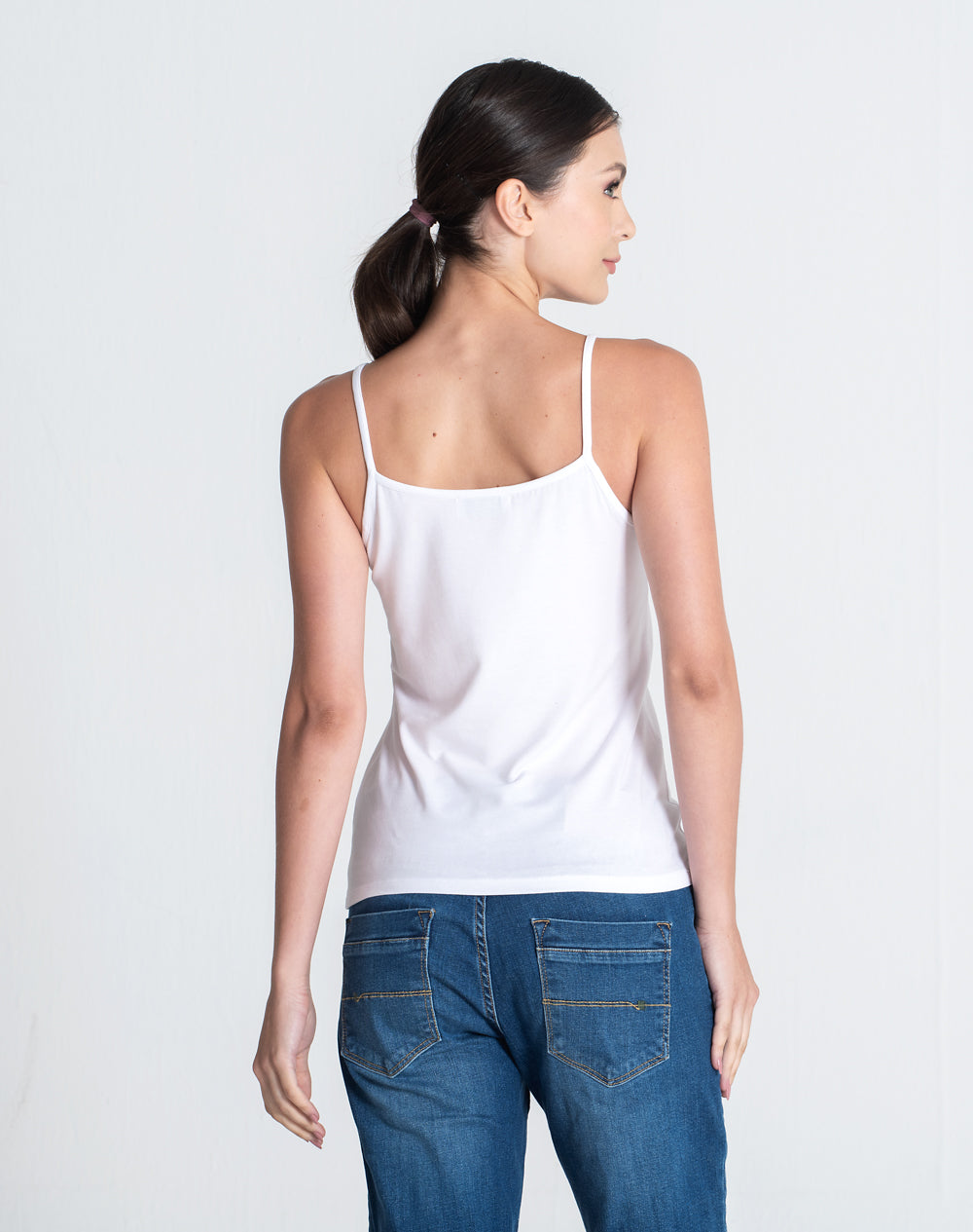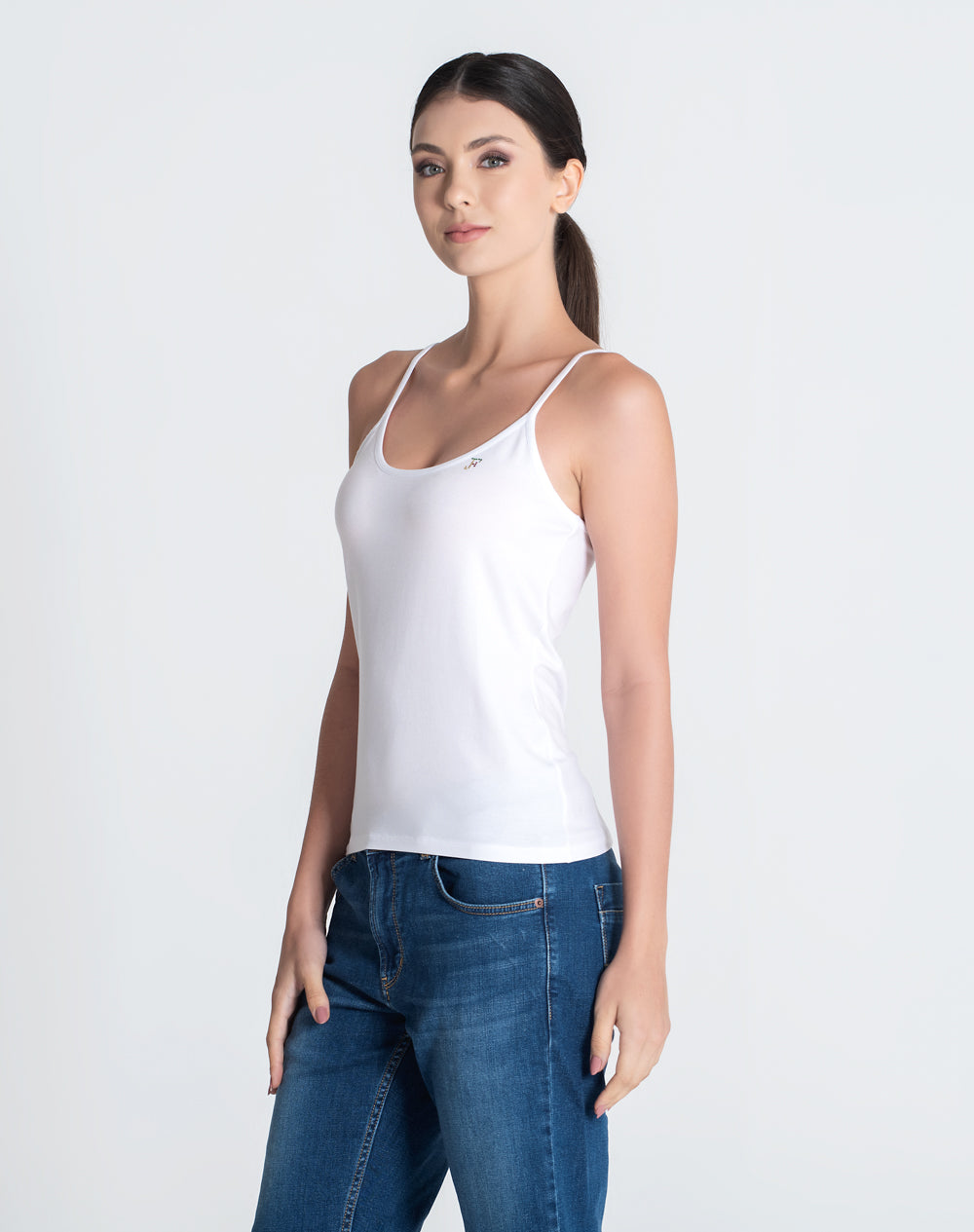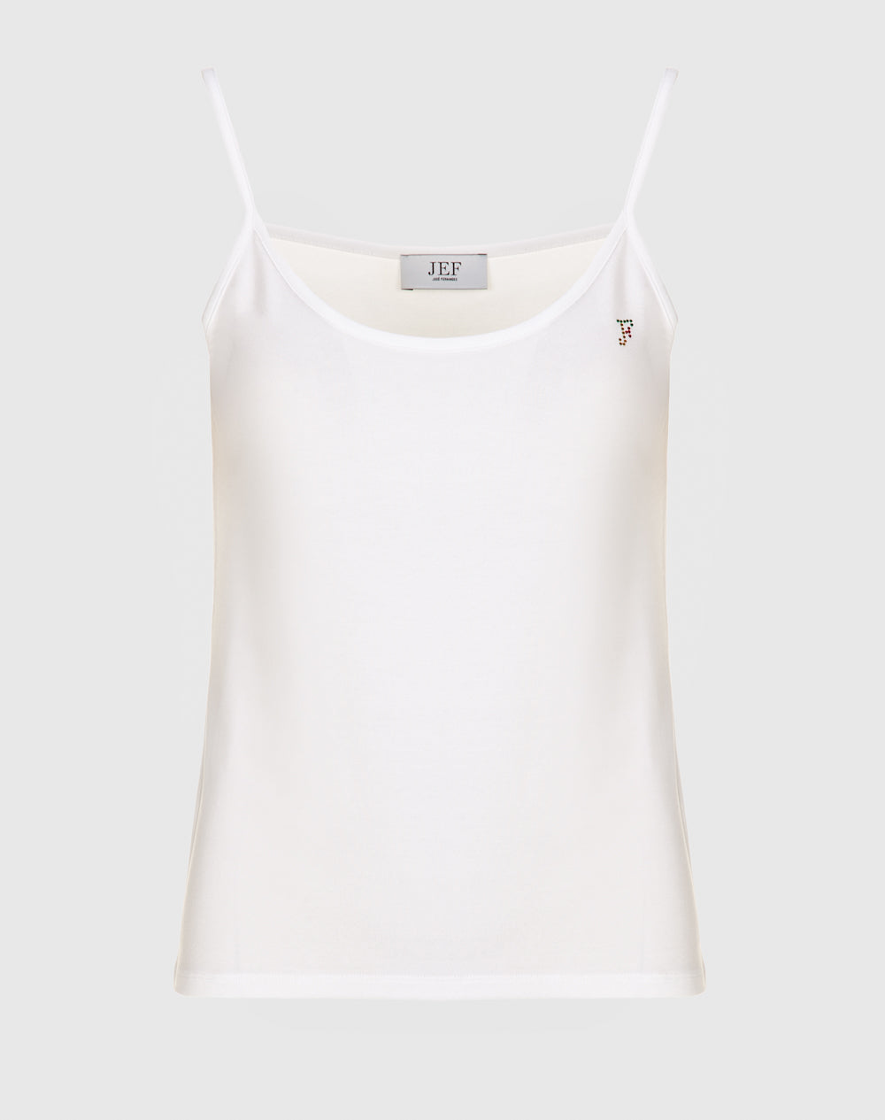Top com alças em lyocell. Decote redondo. Logótipo da marca em pedras brilhantes com as cores da marca.